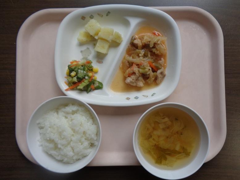 10/8(水)ごはん、すまし汁、鶏肉と野菜の甘酢炒め、こふき芋、オクラのサラダ