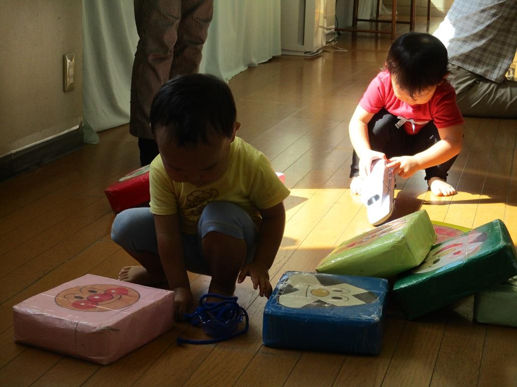 水色帽子の0歳児さんたち。言葉は発しないけれど、やり取りがある様子が見られました。