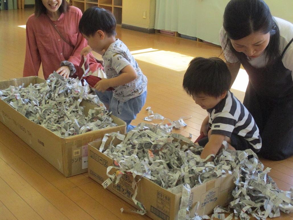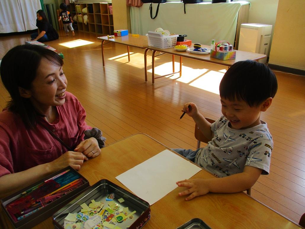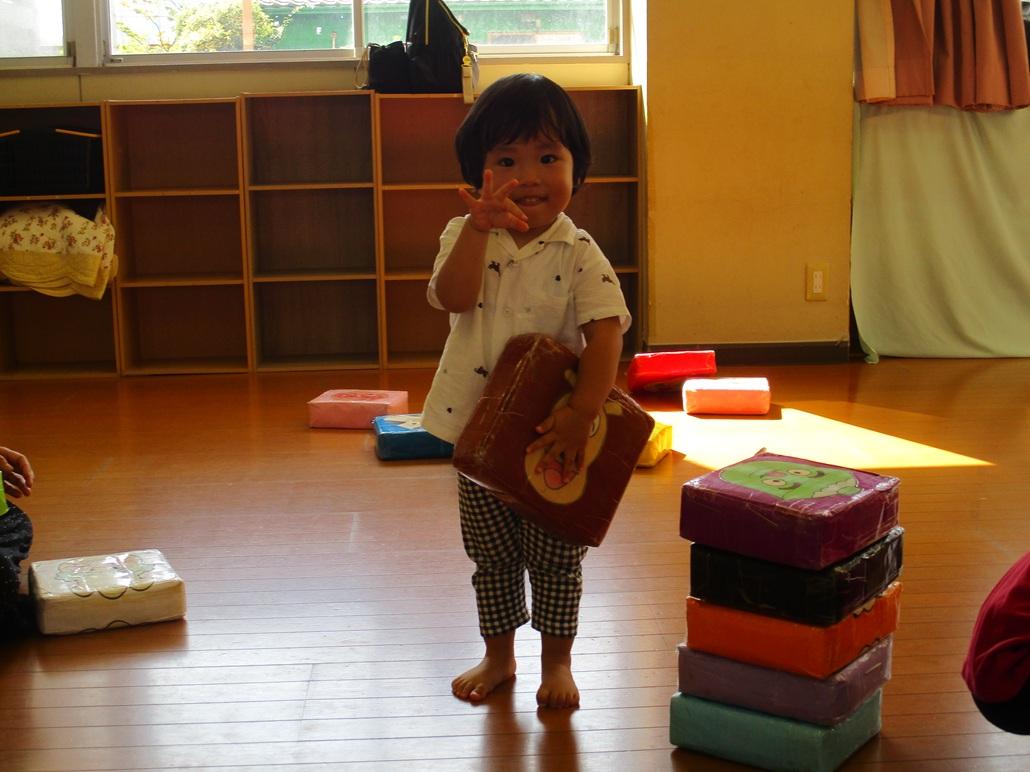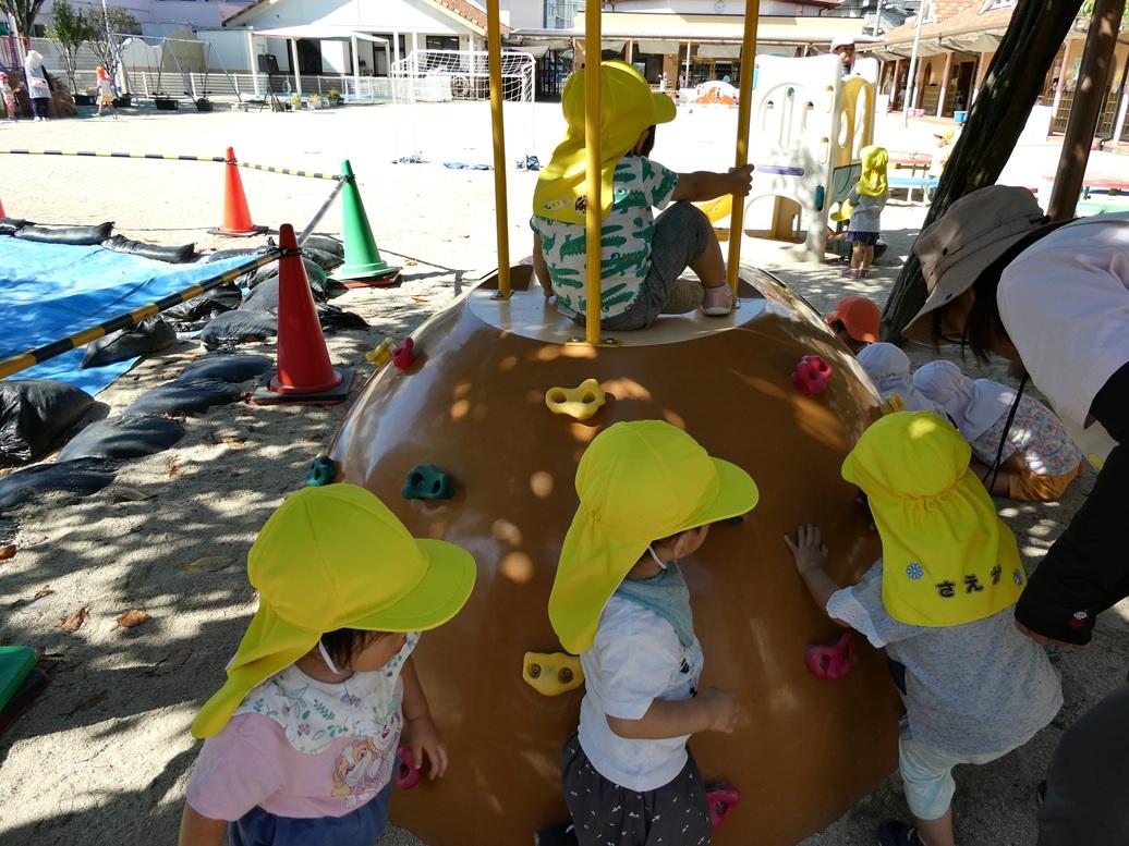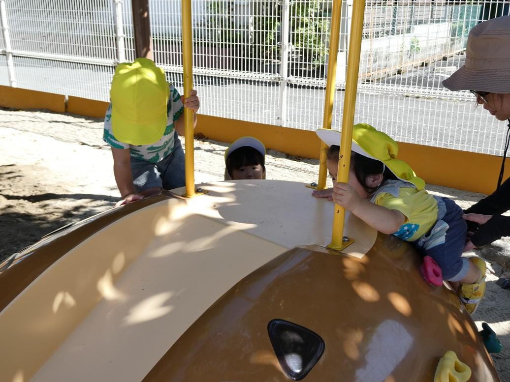 10月9日(木)10時過ぎ、日差しは強く、日陰ができる藤棚近くに行くと、わかば組さんが遊んでいました。