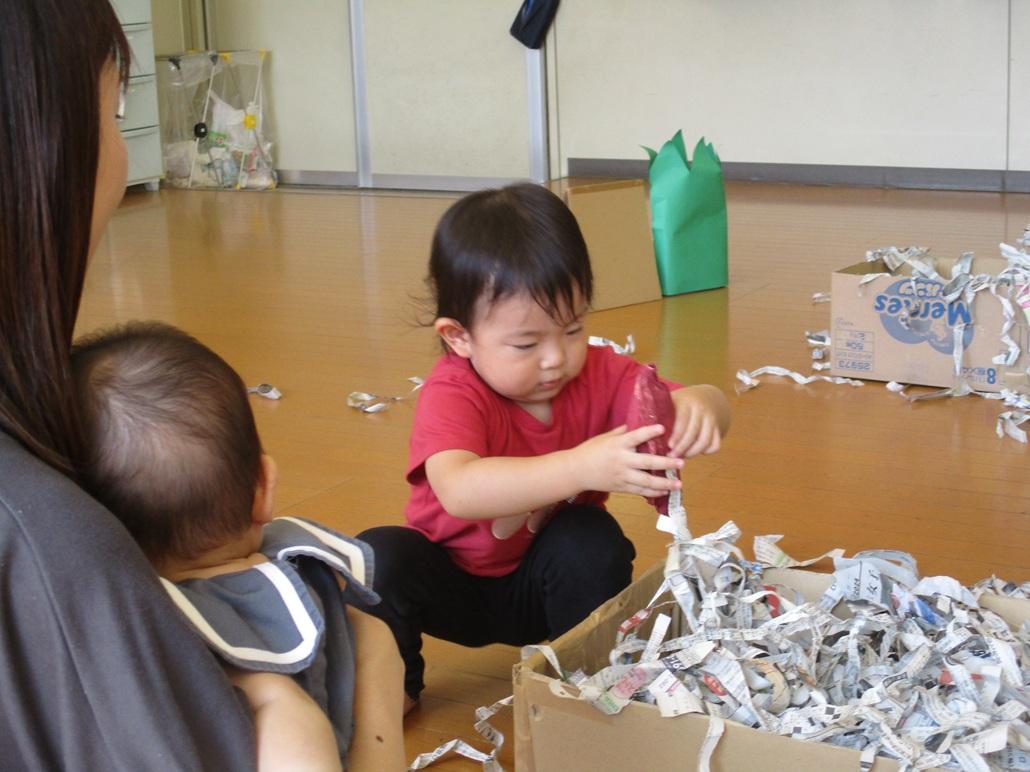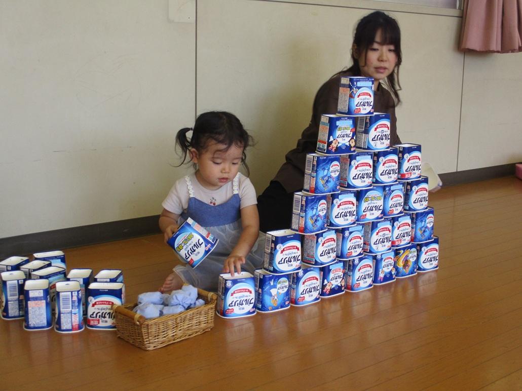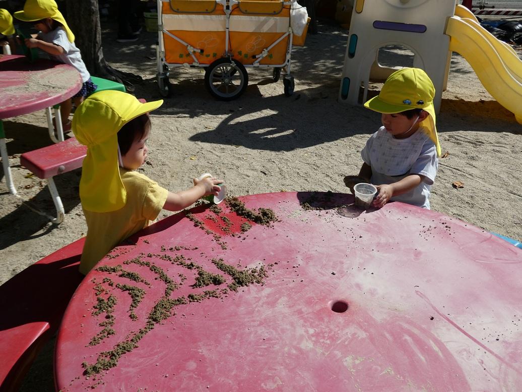 赤いテーブルのところでは、1歳児さんたちがままごと遊びをしていました。カップにお砂を入れたり出したり。上手に座って遊んでいました。