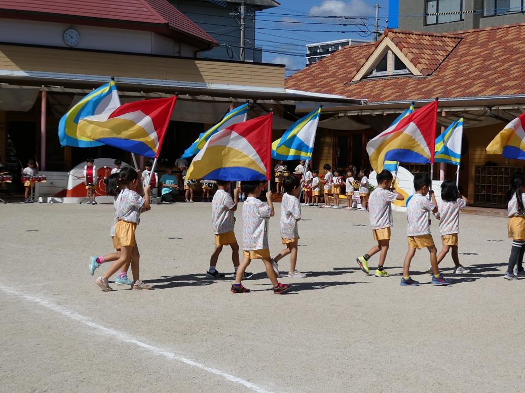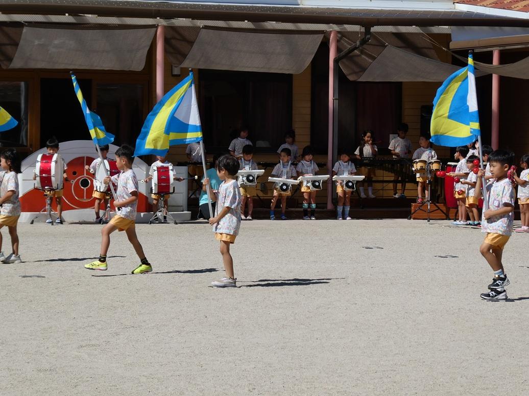年長さんが「練習したい!」と意欲的に取り組んでいるマーチング。今日は明日の発表を前に園庭で練習をしました。一人一人が自分の役割をがんばっています。