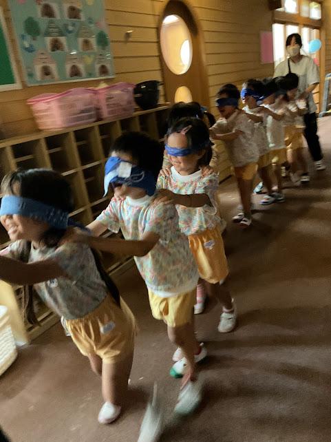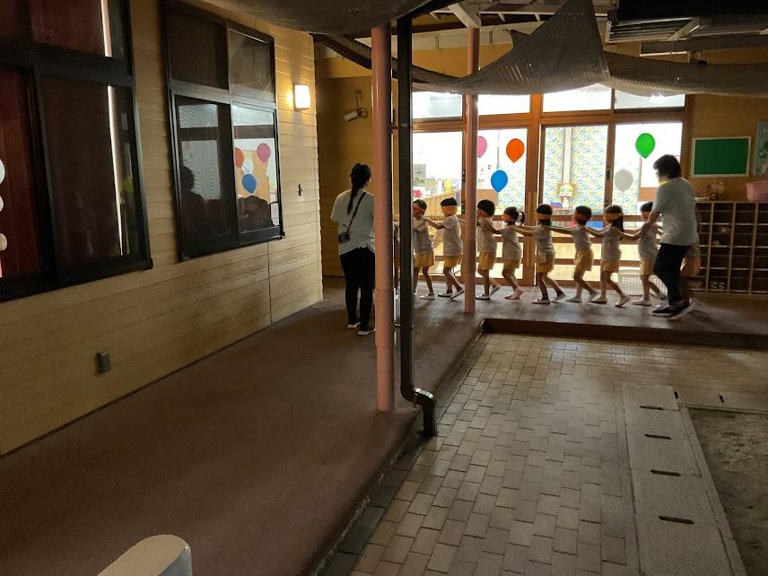 目隠しをして、お楽しみのホールへ向かいます。わくわくが止まりません。