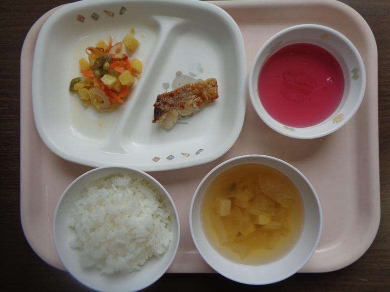 9/22(月)ごはん、すまし汁、魚の味噌焼き、ちくわのさつま芋の旨煮、ぶどうゼリー