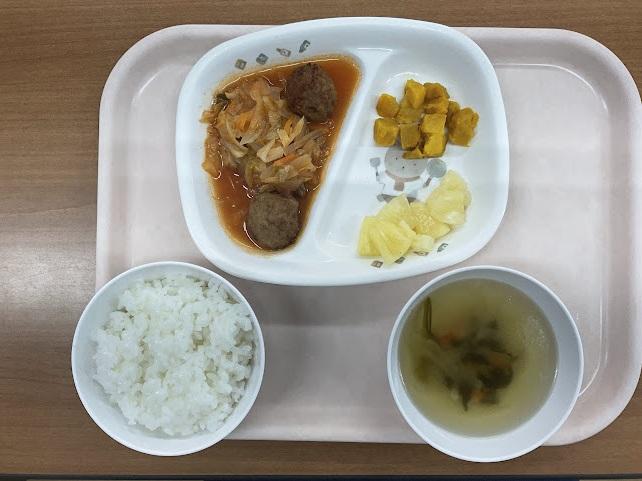 10/17(金)ごはん、コンソメスープ、肉団子と野菜のケチャップ炒め、南瓜のバター焼き、パイン缶