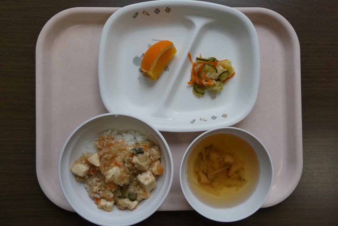 10/16(木)麻婆丼、すまし汁、白菜ときゅうりのサラダ、オレンジ