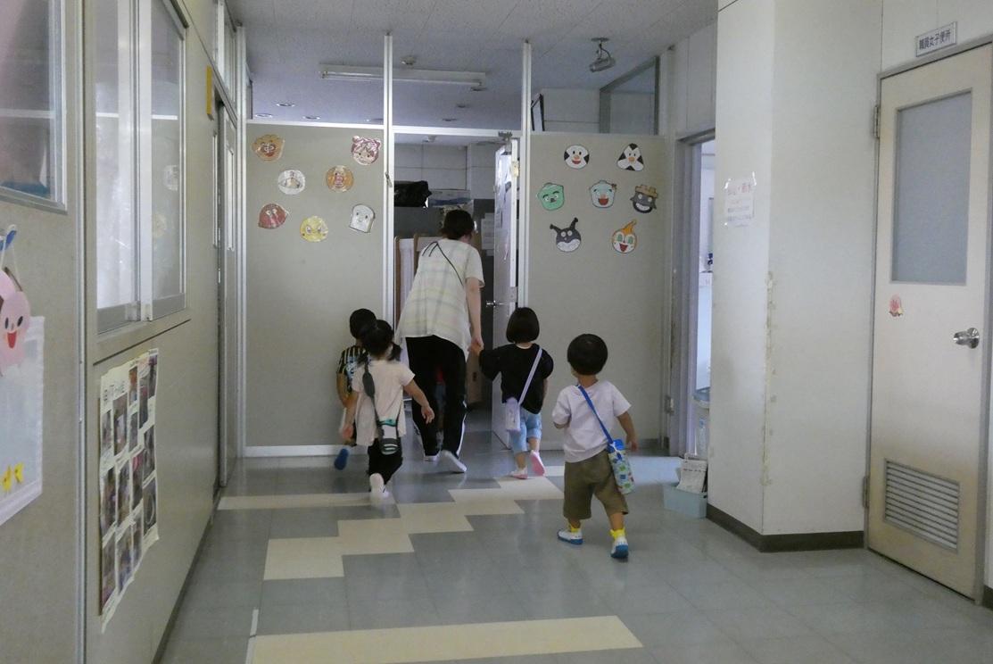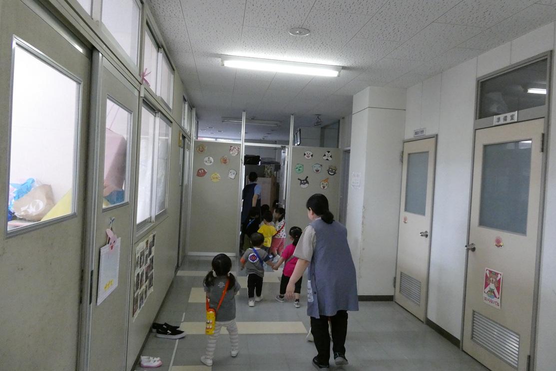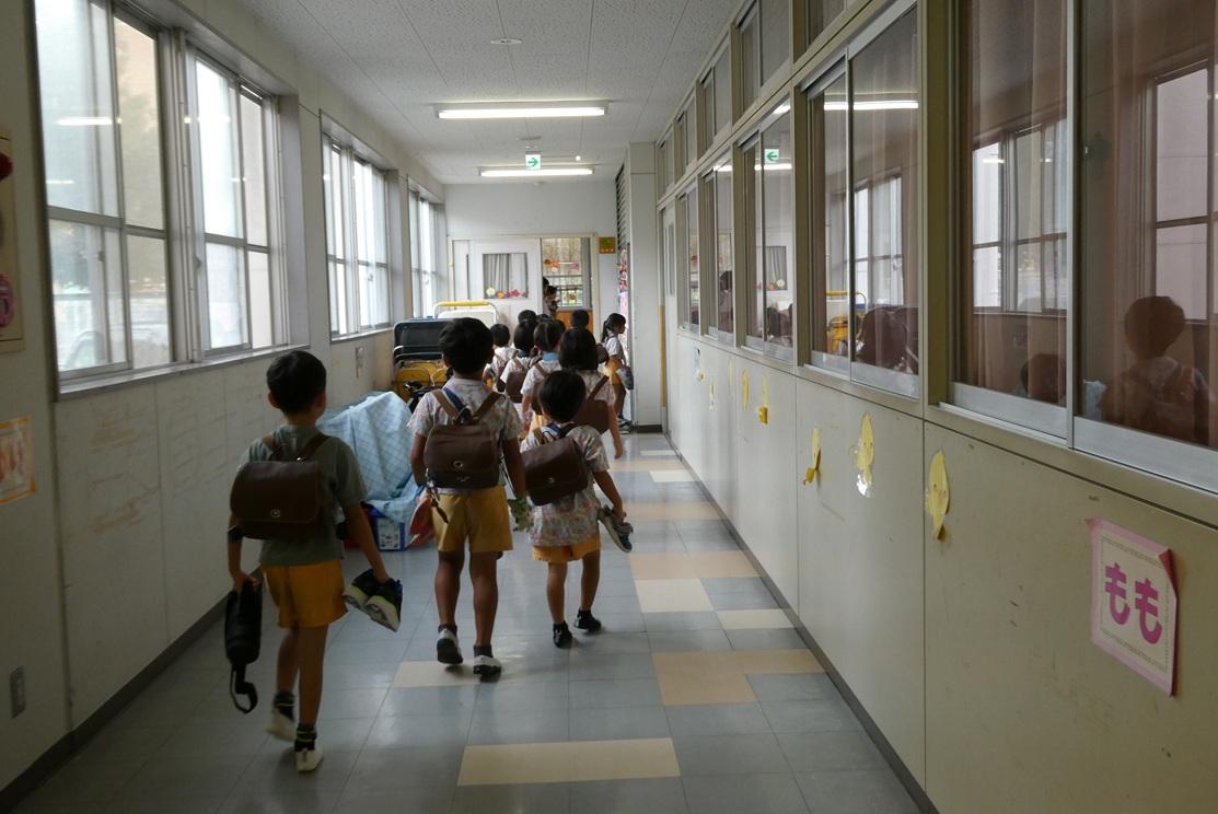 今回の訓練は5月に続いての2回目でしたので、水筒、茶色カバン、靴(2歳・満3歳児は水筒のみ)を持って階段を上って避難する訓練としました。3階へ避難することを放送で聞いた後、先生たちと一緒に各クラスごとに避難を始めましたが、どのクラスもしーんと静かに落ち着いて階段を上っていきました。0・1歳児は歩ける子は歩いて、だっこの方が安全な子は先生たちにだっこされて3階へ上がりました。