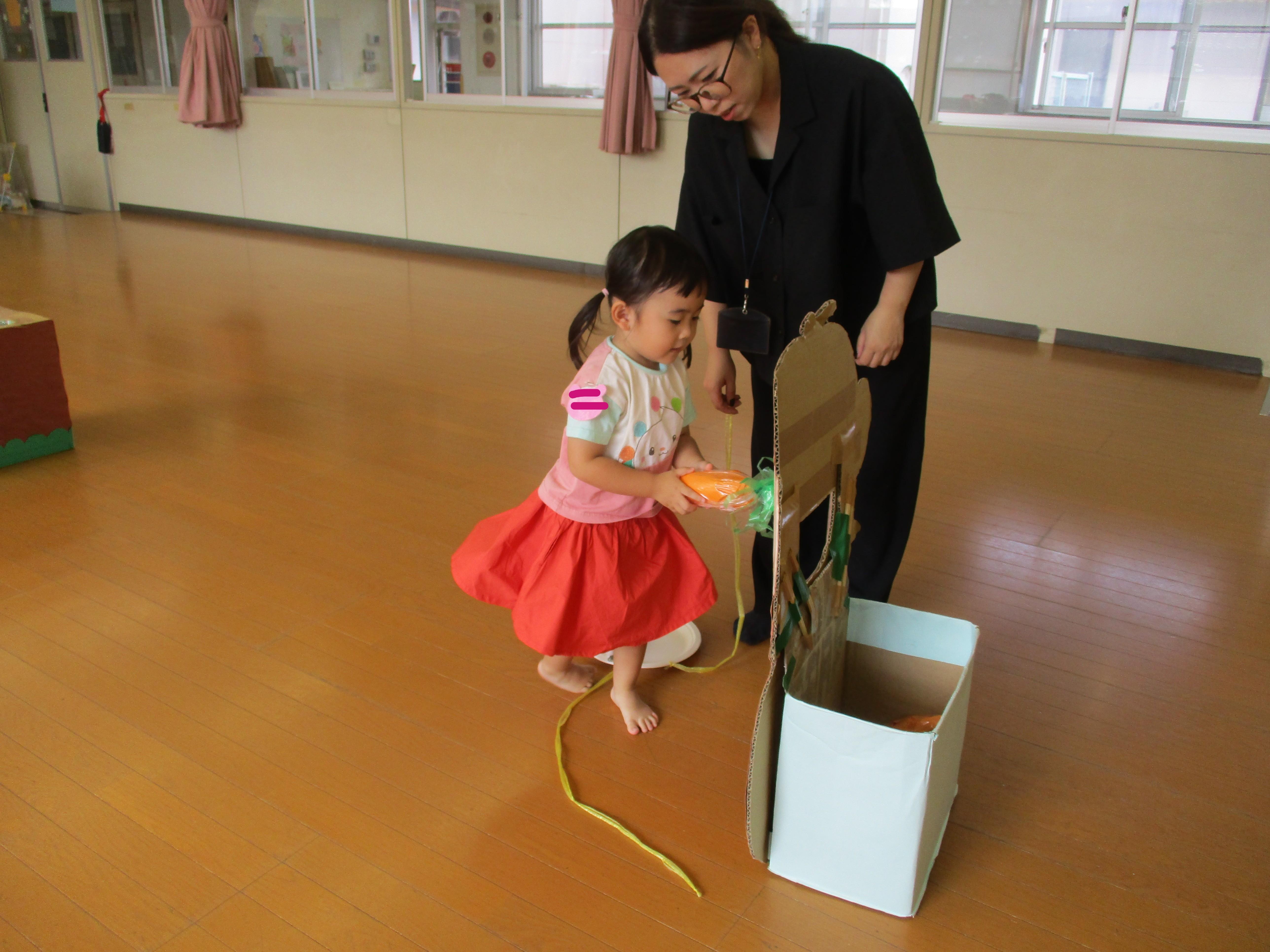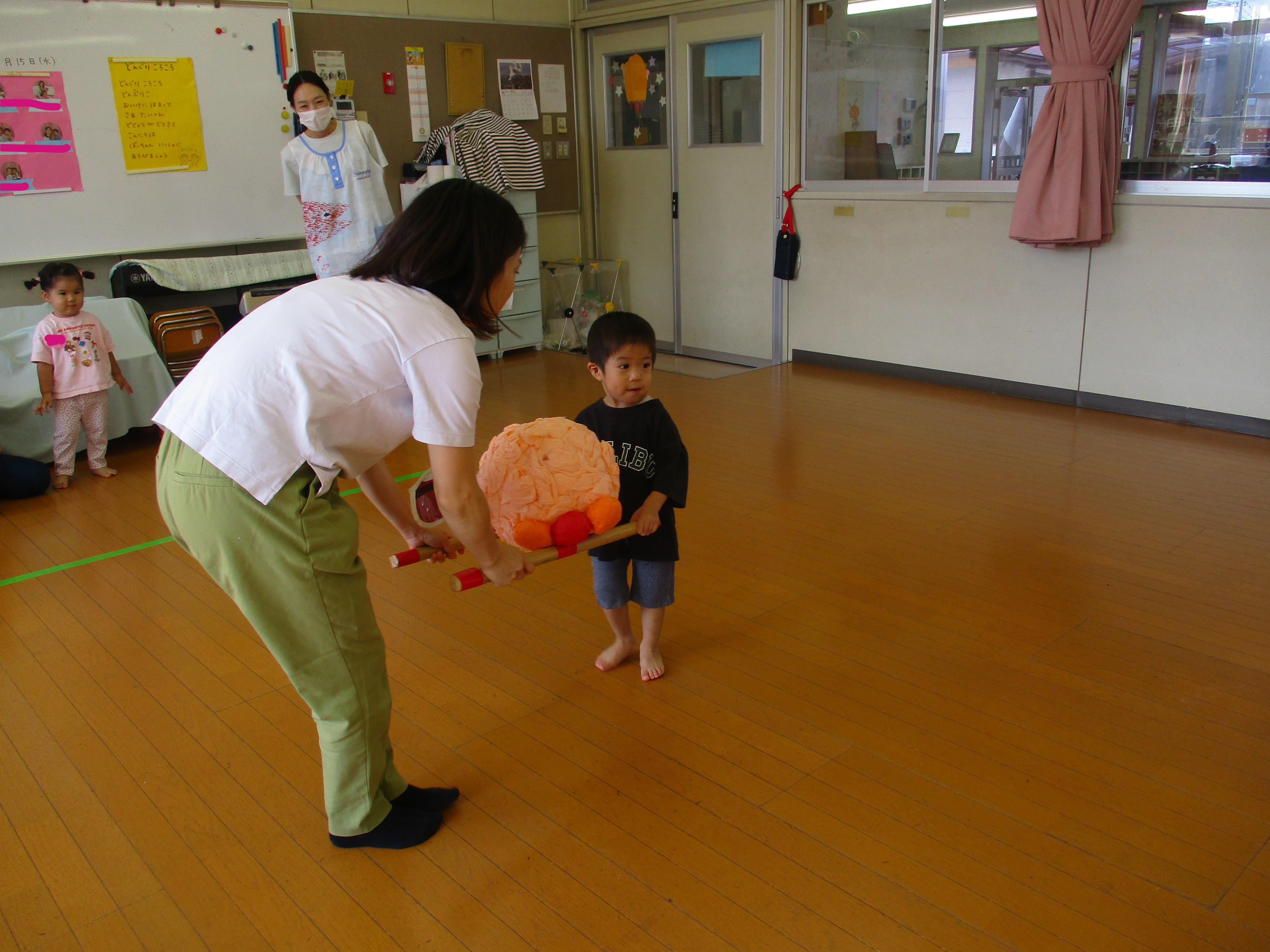 今週のサロンは、玉入れをしたり、アンパンマンボールを運んだり親子で体いっぱい動かして遊びました。