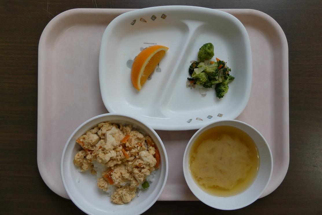 10/20(月)豆腐と卵のふわふわ丼、ほうれん草の中華和え、オレンジ、みそ汁