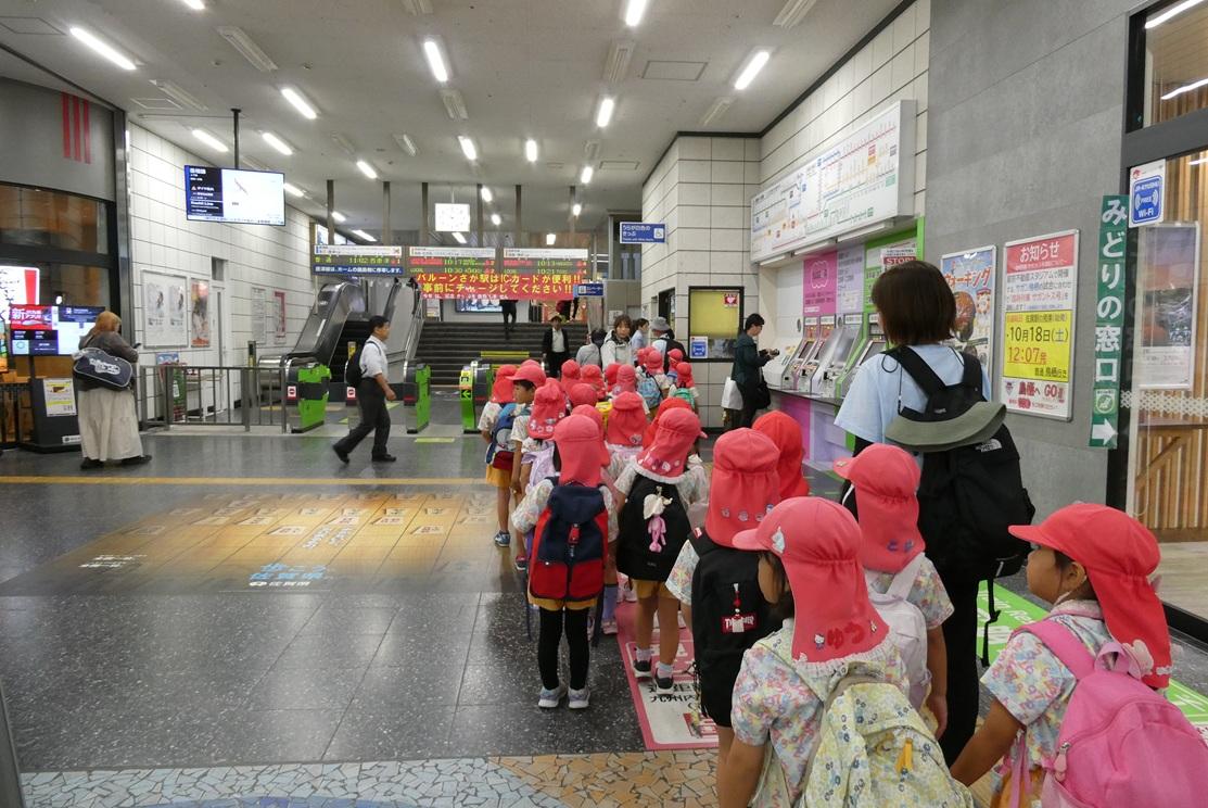佐賀駅では電車に乗る前から、まちの人と出会う社会体験に緊張気味でしたが、駅の階段を上ったり下りたり、みんなで安全に行動できました。