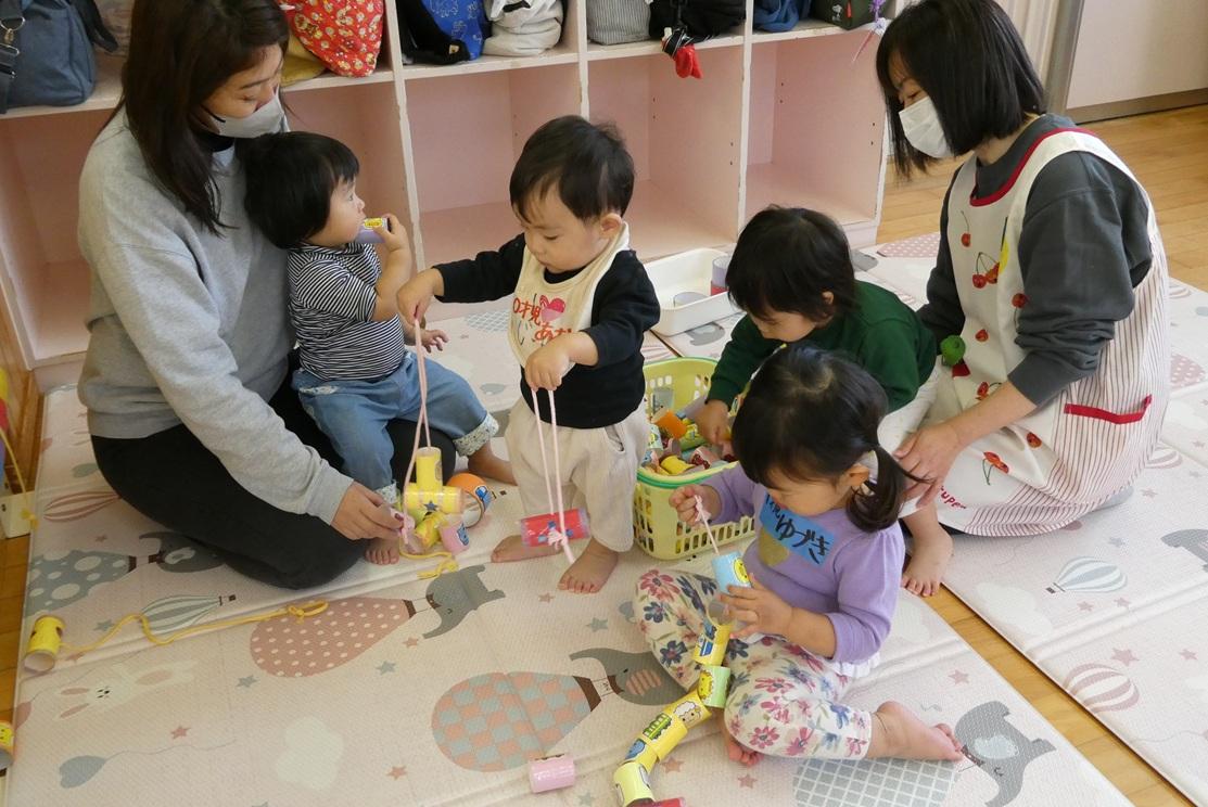 ひも通し遊びも人気でした。ひもに通すおもちゃはトイレットペーパーや段ボールの芯で作ったもので、子どもたちが好きな動物や乗り物の絵をつけたものでした。遊ぶうちにいろいろな遊びに発展して、腕にはめたり、足にはめたりいろいろな楽しみ方をしていました。