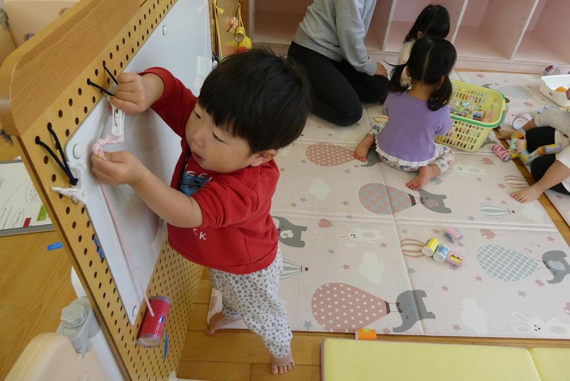 遊んでいるうちに、ひもをボードに取り付けた洗濯ばさみに付ける子どももいました。1回目はタイミングが合わず、紐が落ちてしまったけれど、もう一回挑戦して手を離すタイミングを合わせて、洗濯ばさみに紐をはさめることができました。誇らしげな表情に「すごいね」と拍手を送りました。