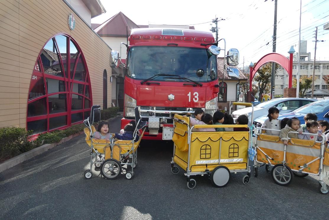 さらに、風が強く火災が広がる恐れから近くの大藤公園まで歩いて避難する内容でした。その間も子どもたちは落ち着いて避難することができました。大藤公園では消防士さんと一緒に「お・は・し・も」の確認をしました。