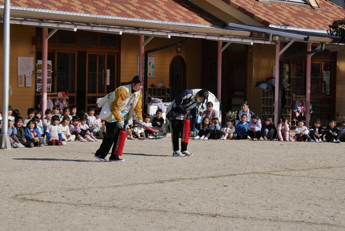 園庭では、先生たちが初期消火に用いる消火器の使い方の練習をしました。