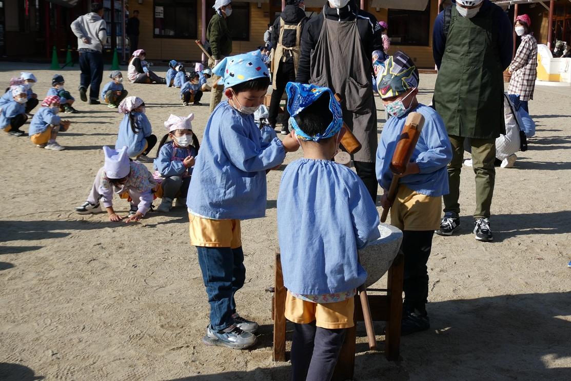 わかば組さん、つぼみ組さん、すずらん組さんが見守る中、年少さん、年中さん、年長さんが順番に杵を持ってもちつき体験をしました。見守るお友だちも「一、二、三。一、二、三。」とリズムを作るための掛け声をかけたり、「がんばれ!がんばれ!」と応援したりしました。子どもたちにとって貴重な体験です。
