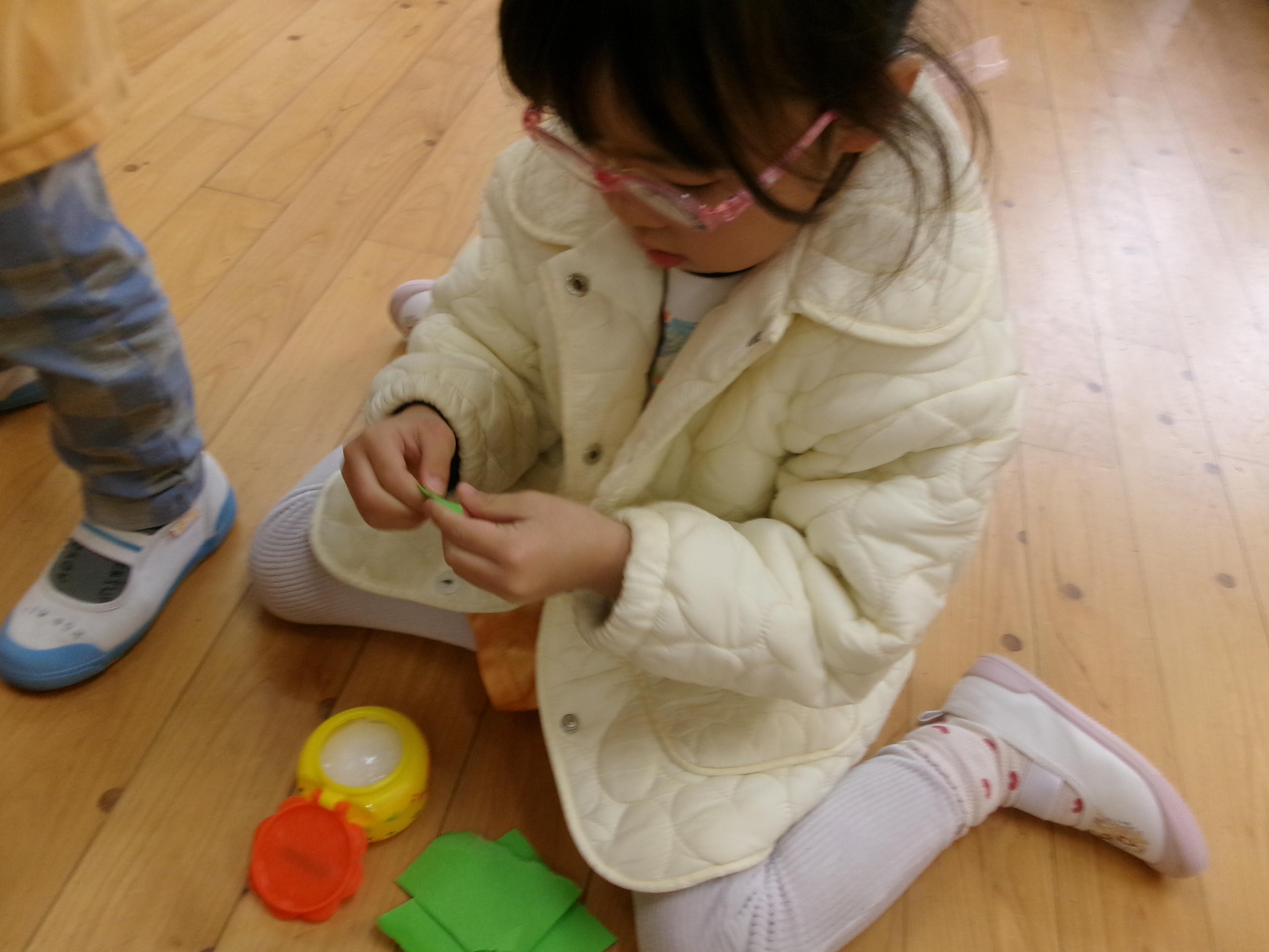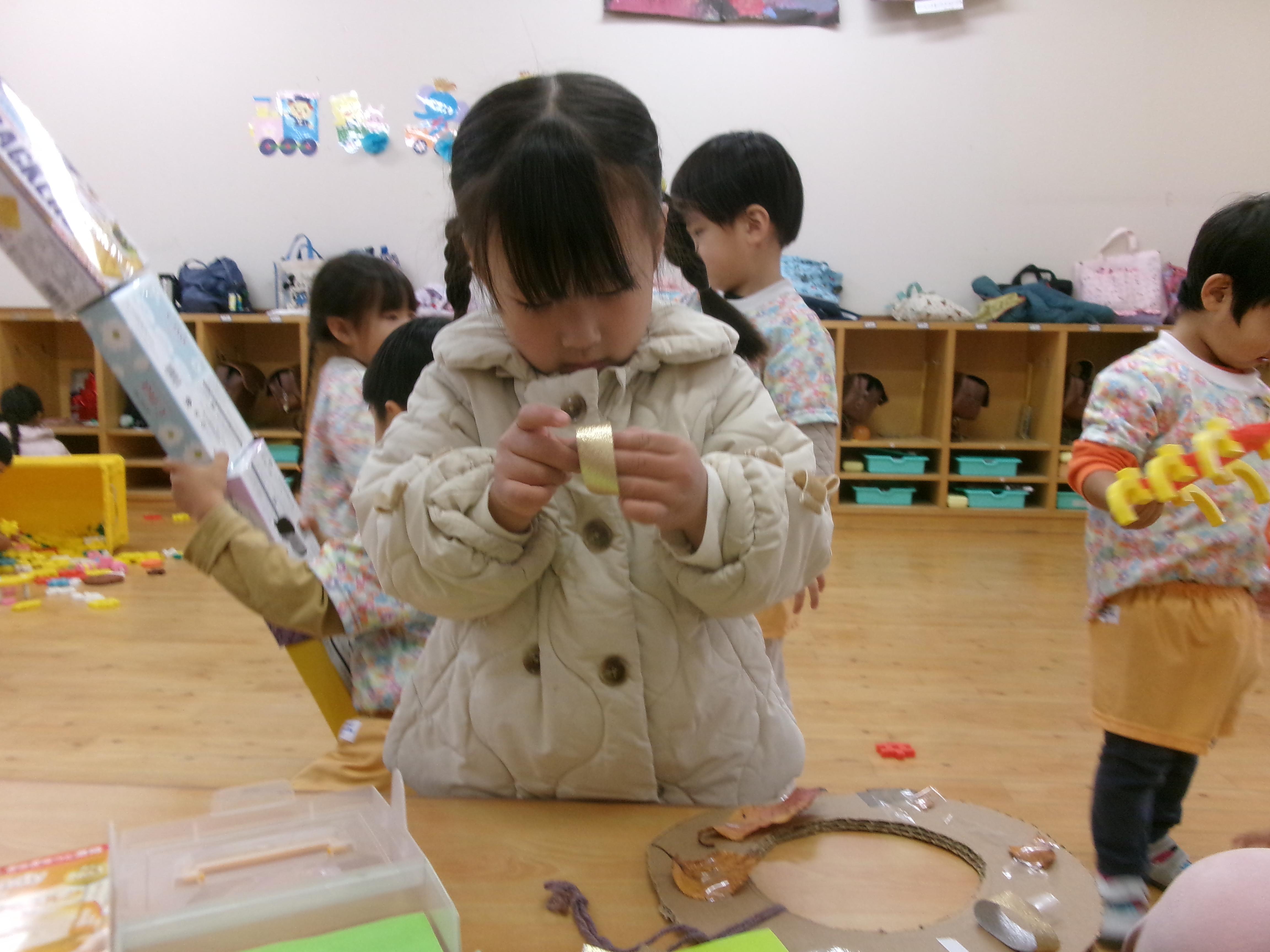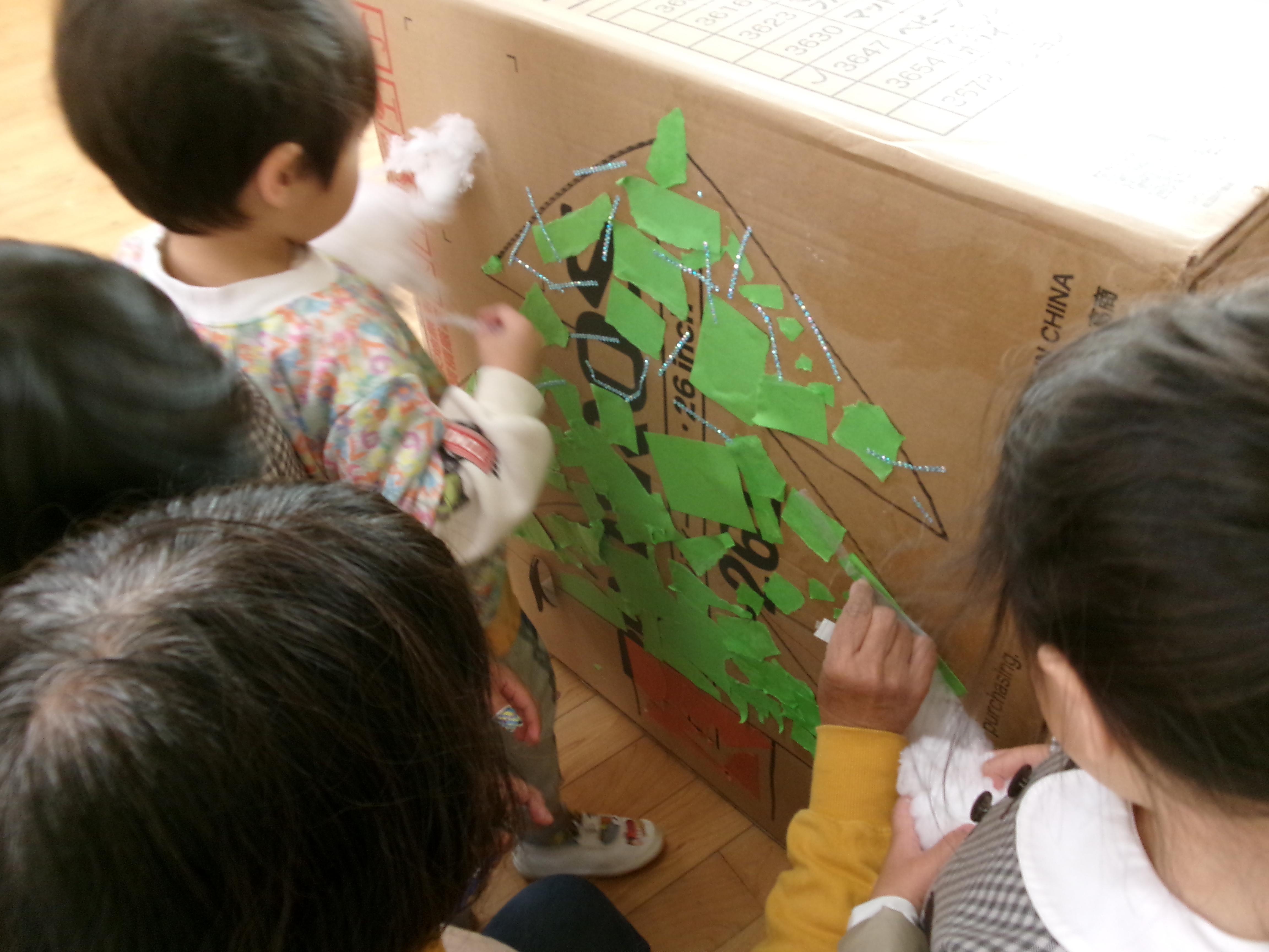たんぽぽ組では大きな段ボールでクリスマスツリーを作りました。画用紙をちぎってのりを指で取り段ボールにぺたぺたと貼り付けていました。
