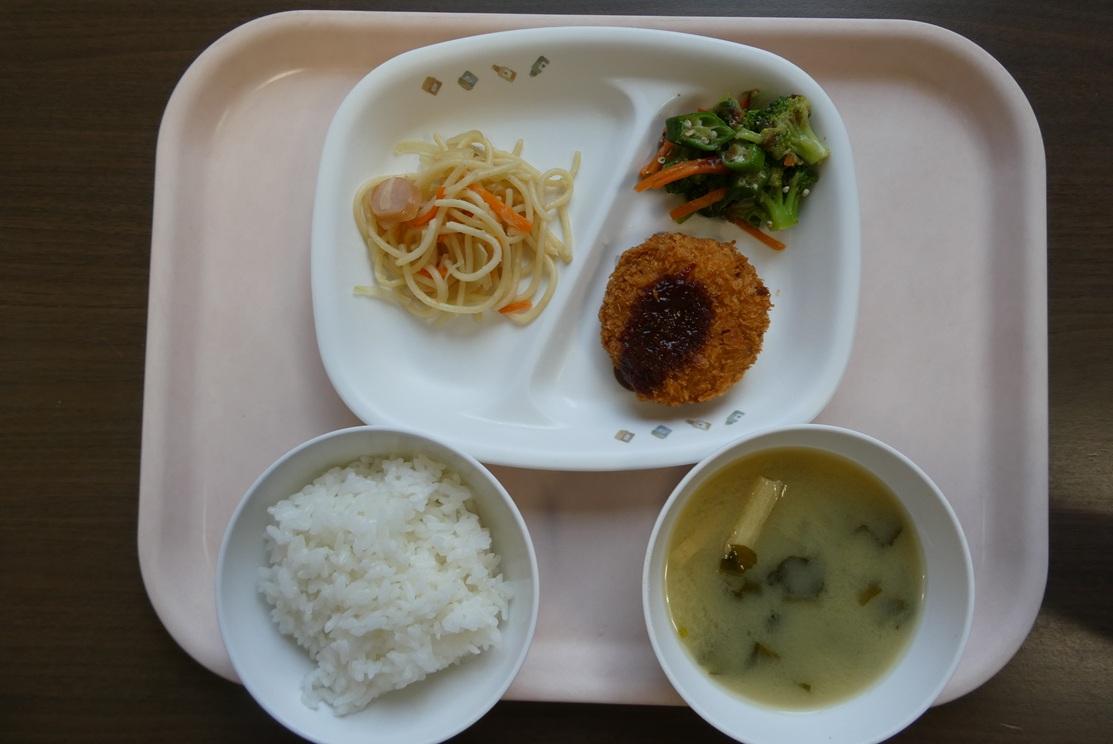 2/2(月)ごはん、みそ汁、メンチカツ、和風スパゲティソテー、オクラのおかか和え