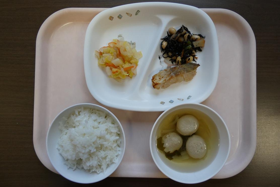 2/3(火)ごはん、いわしつみれ汁、魚の照り焼き、大豆とひじきの煮物、白菜の甘酢和え