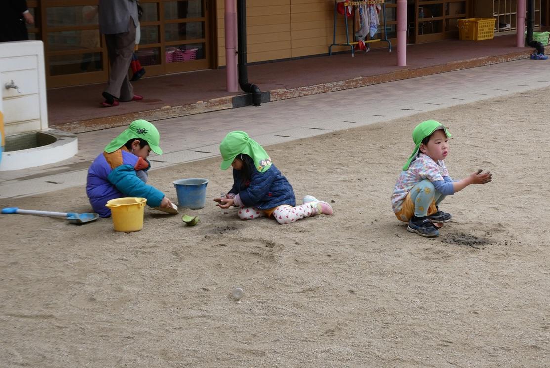 身支度を済ませてすぐに園庭に出て泥だんご作りや泥遊びを始める