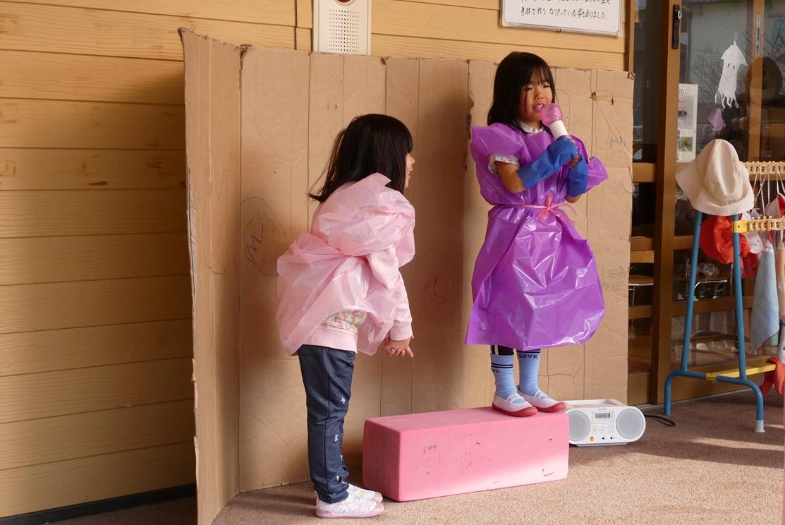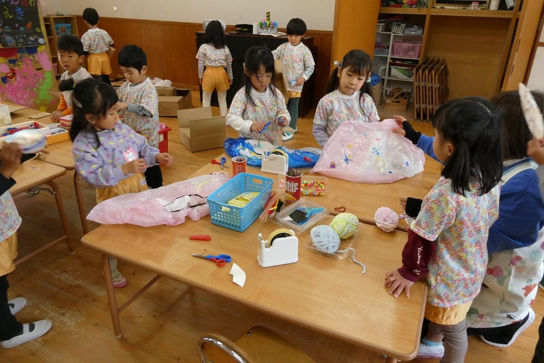 保育室内では、生活発表会、豆まきと遊び続けている大きな鬼に新聞玉を投げ込む