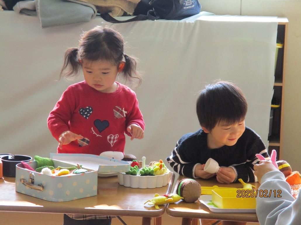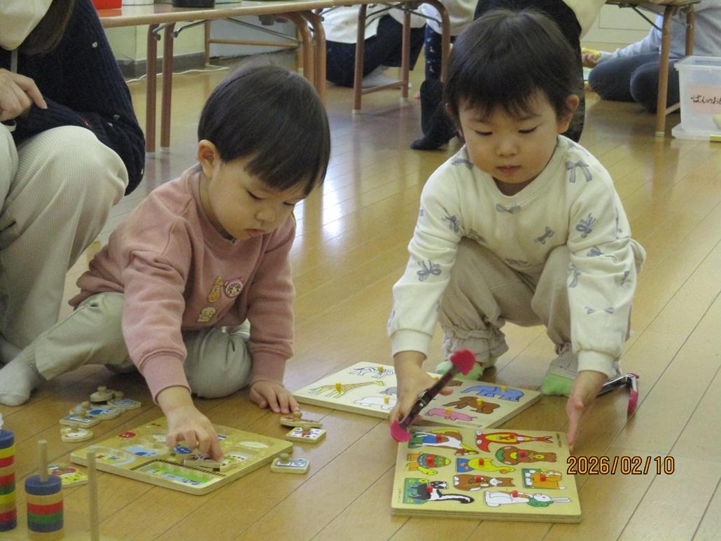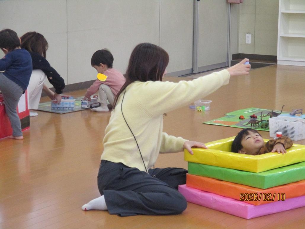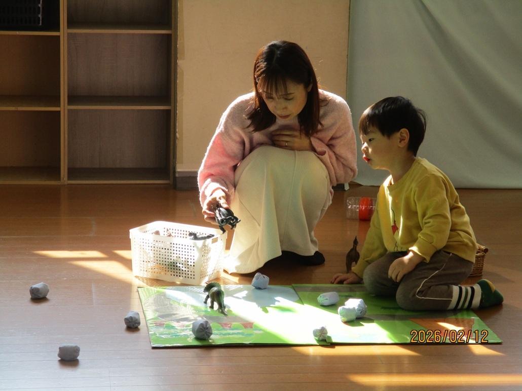 好きな遊びを見つけ、お母さんを誘って遊んだり、友だちと一緒に玩具で遊びました。