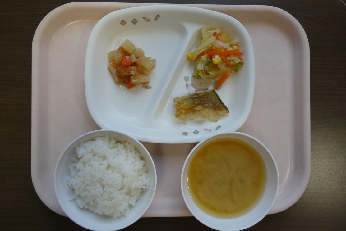 2/26(木)ごはん、みそ汁、魚のカレームニエル、さつま揚げと大根の煮物