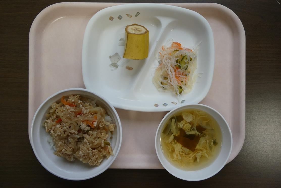 2/27(金)シャキシャキそぼろ丼、かきたま汁、春雨サラダ、バナナ