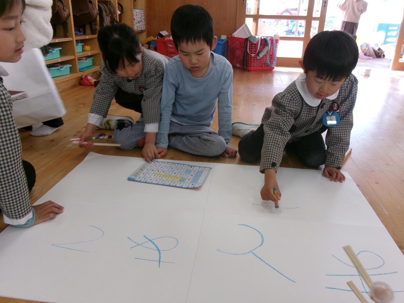 自分たちでひらがな表を見ながら、看板を作っています!
