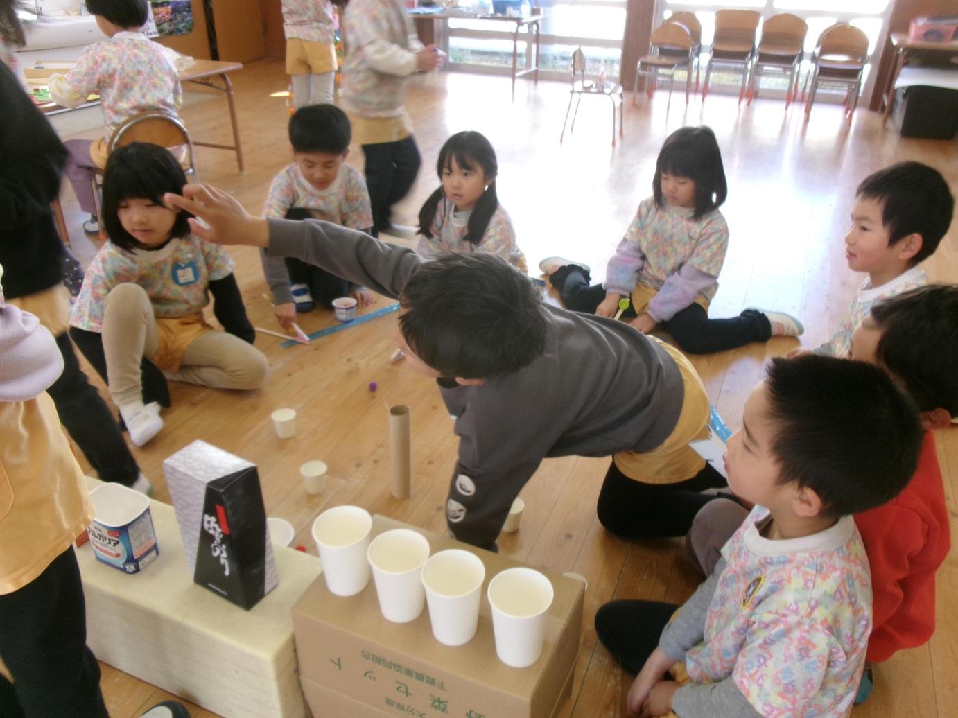 室内にあったたくさんのヤクルトカップを見つけて花紙を詰めていました。