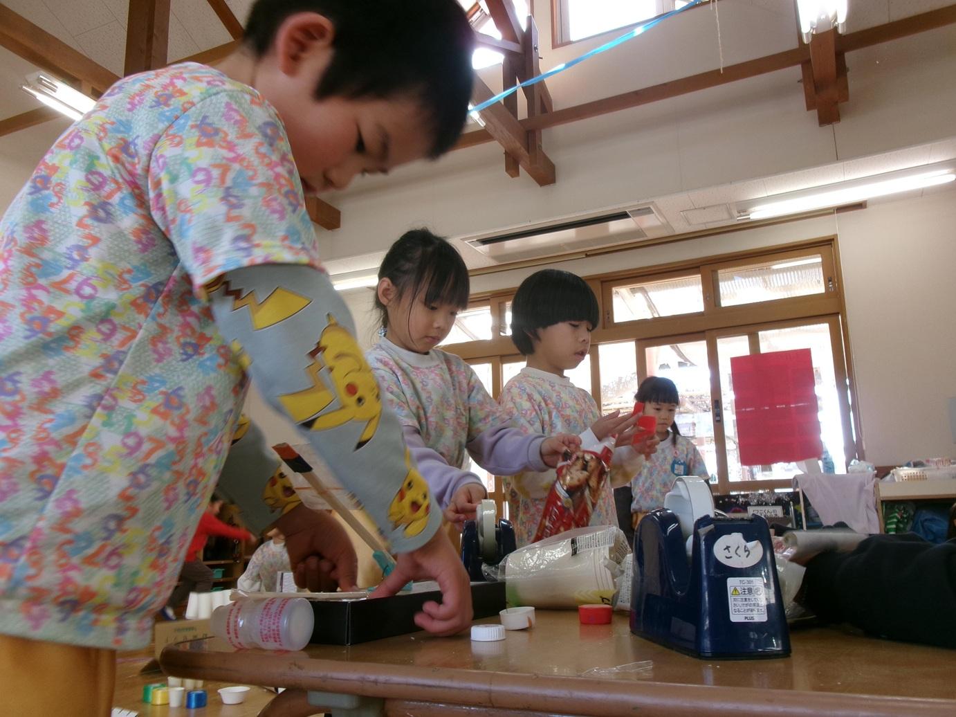 「水を入れたらジュースみたいに見えるかも!」「でもこぼれるね」と友だちと考えていく中でキャップをはめてテープで抑えるという子どもたちのアイデアから「これは景品にしたい!」と楽しみにしながら作っています。