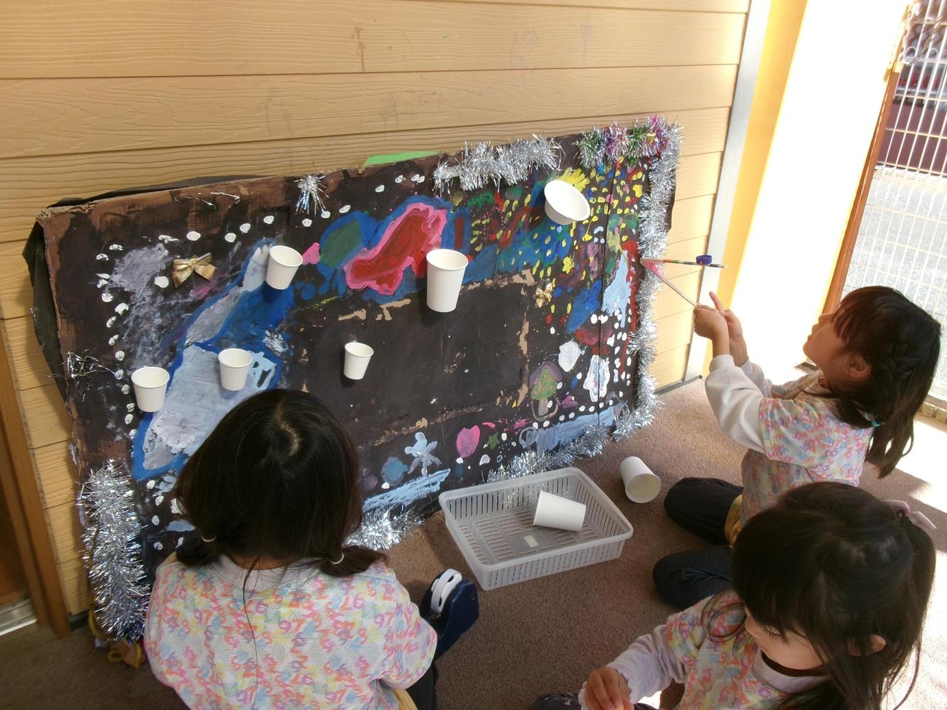 話し合って遊んでいく中で、室内にあった段ボールに紙コップや紙皿を張り付けて遊ぶ姿が見られました。