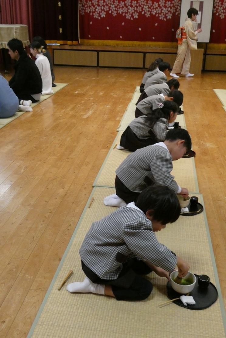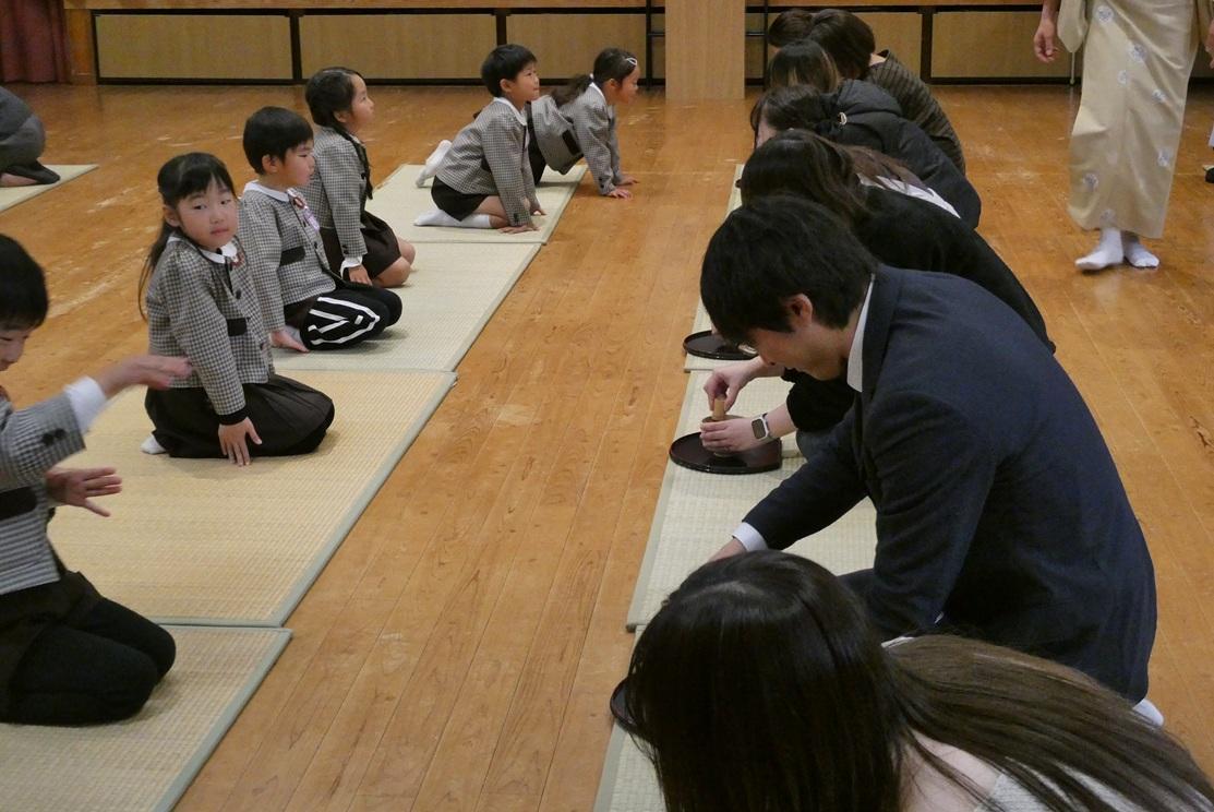 はじめは、子どもたちがこれまで学んできたことを保護者の方の目の前で披露しました。子どもたちは自分が点てたお茶を味わってもらい、どきどきしている様子がうかがえました。おうちの方の「おいしい!」という笑顔に子どもたちは嬉しかったようです。