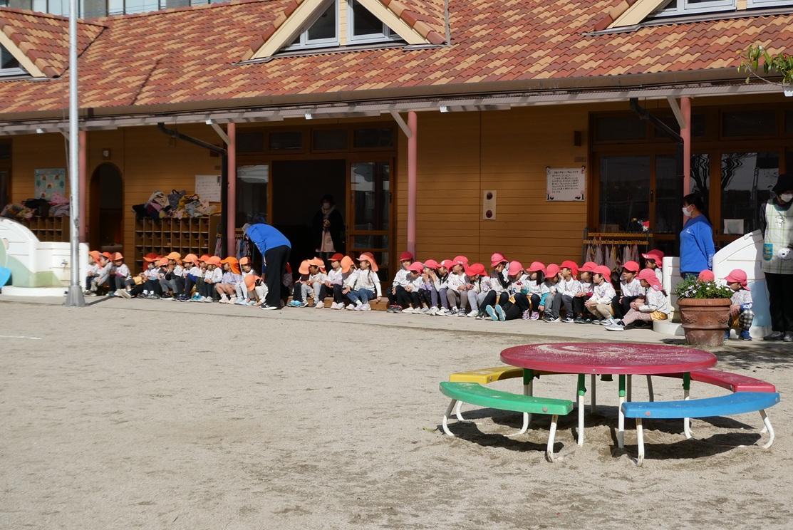 はじめに、全園児が園庭を向いて廊下に座って集合しました。