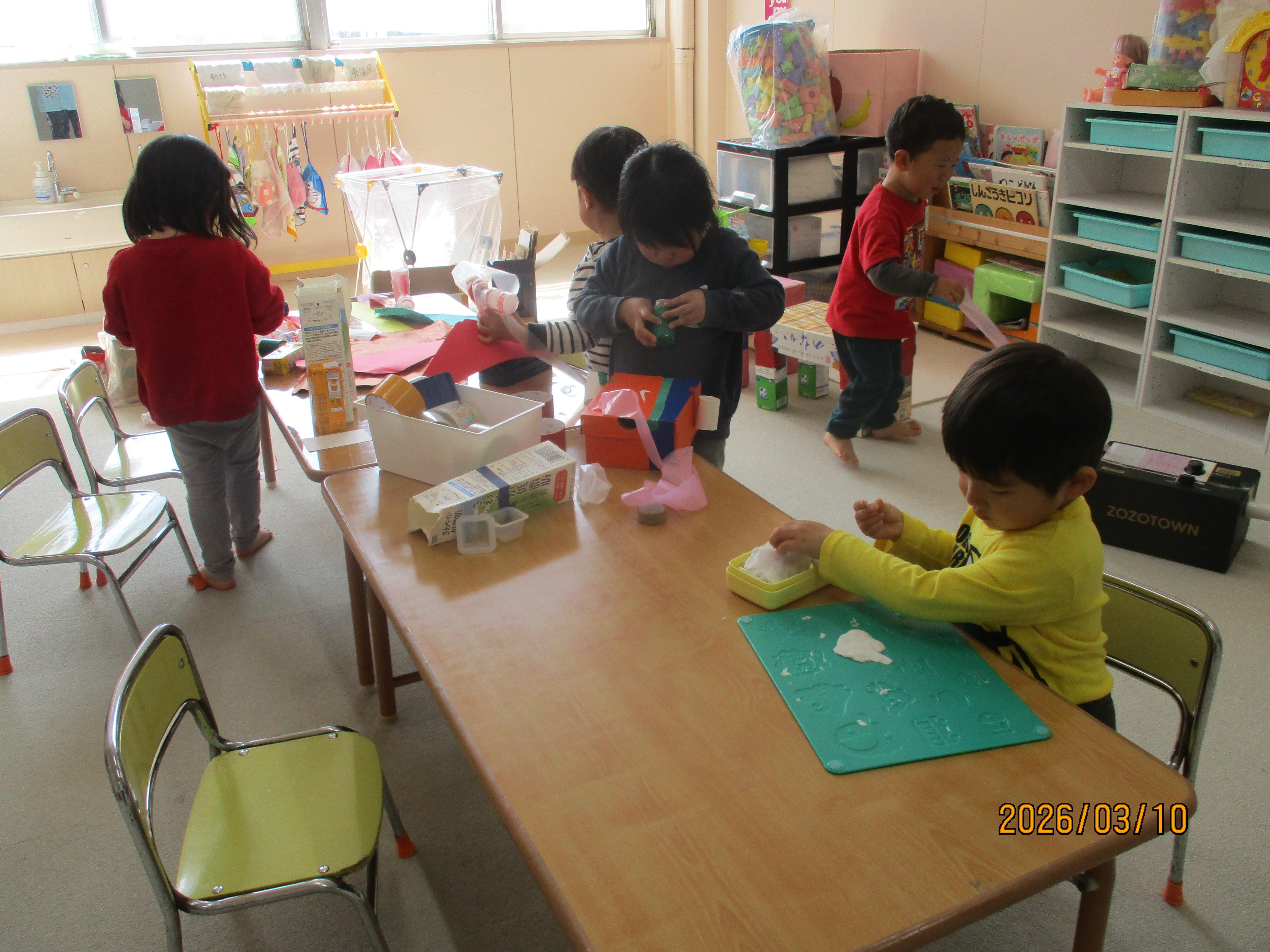 室内遊びでは、素材を使った遊びを楽しんでいます。好きな素材を集めて、作りたい物を想像しながら作成し、出来上がったものを見て、「○○みたい!」と発見する姿もありました。また、レンジャーになりきり、ごっこ遊びも楽しみ、友だちと関わる楽しさも感じられているようです。