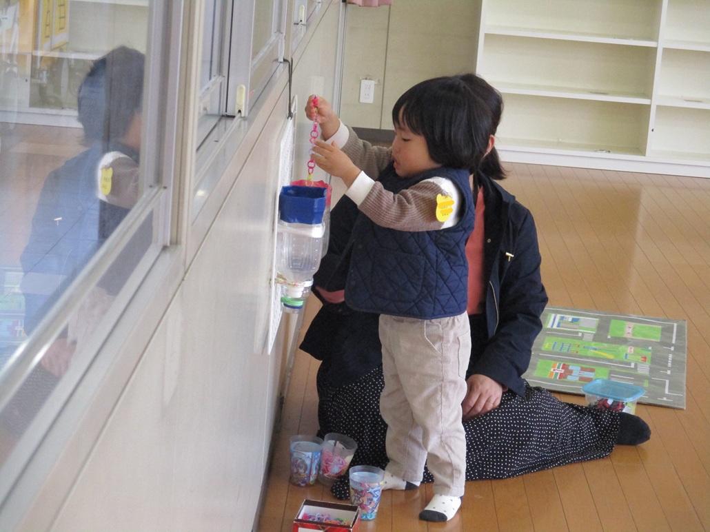 今週は、ペットボトル通しコーナーにつなげたビーズを準備しました。ジュースにしてみたり、つぎわけたりしてごっこあそびでも楽しみました。