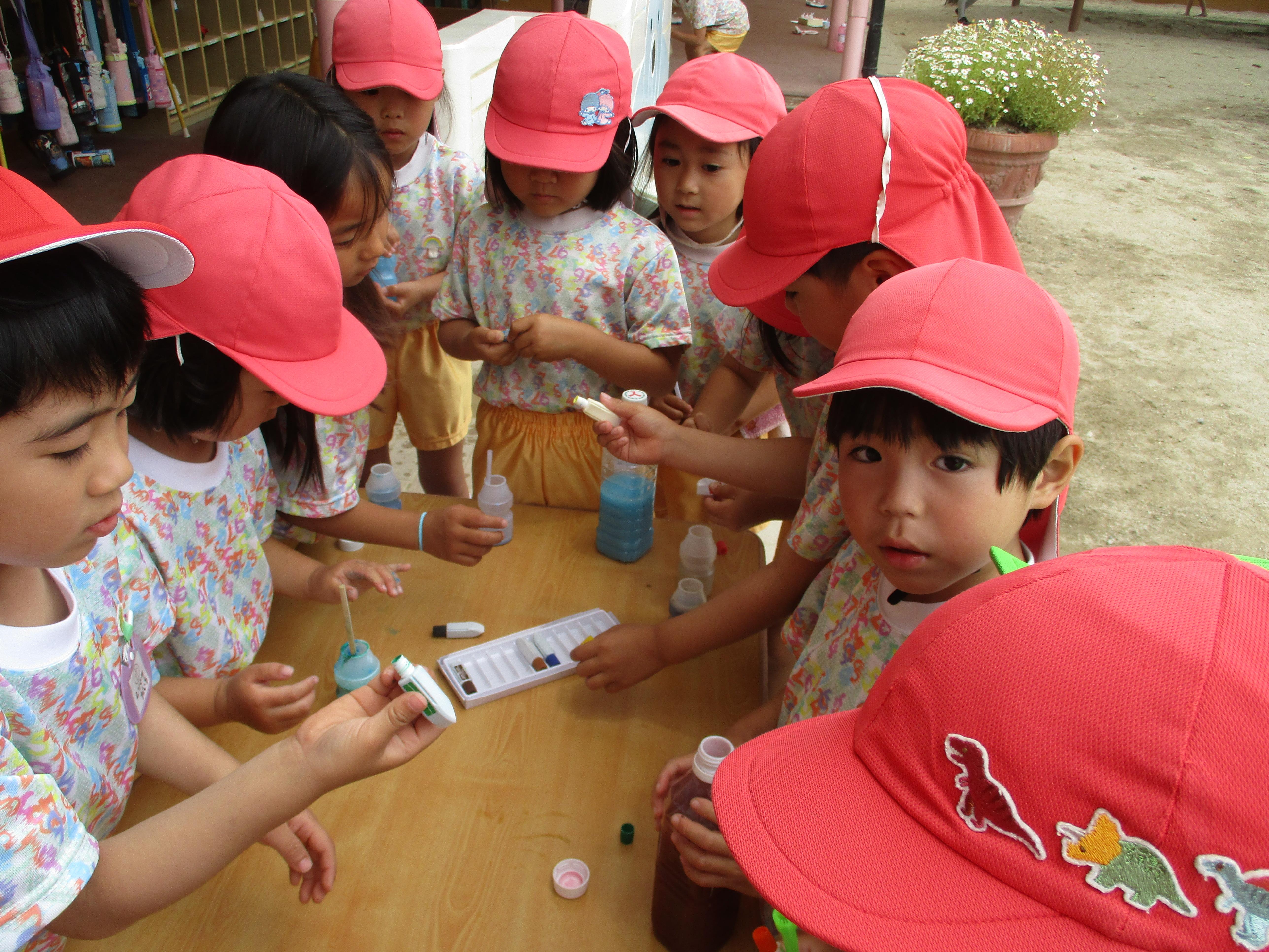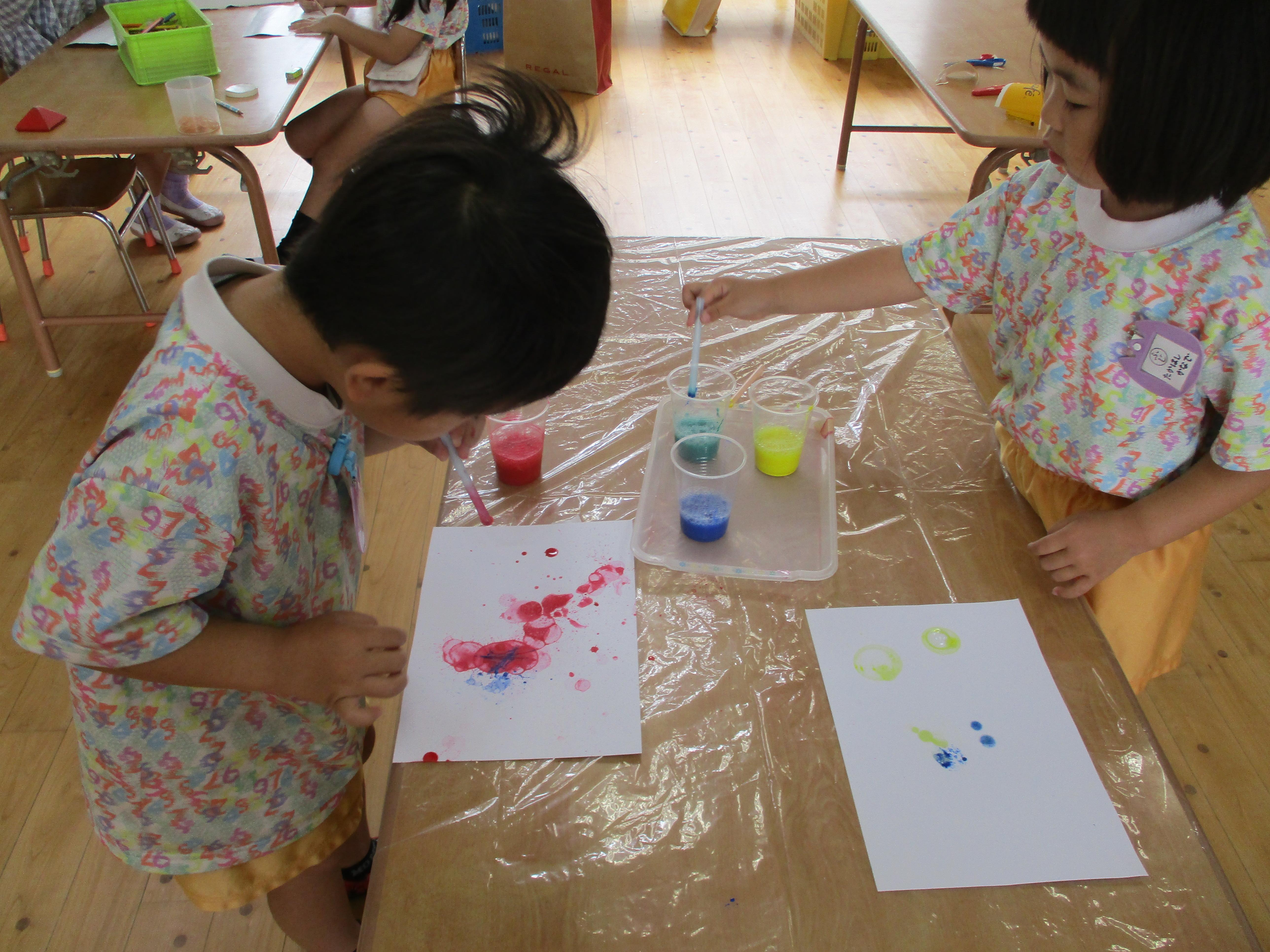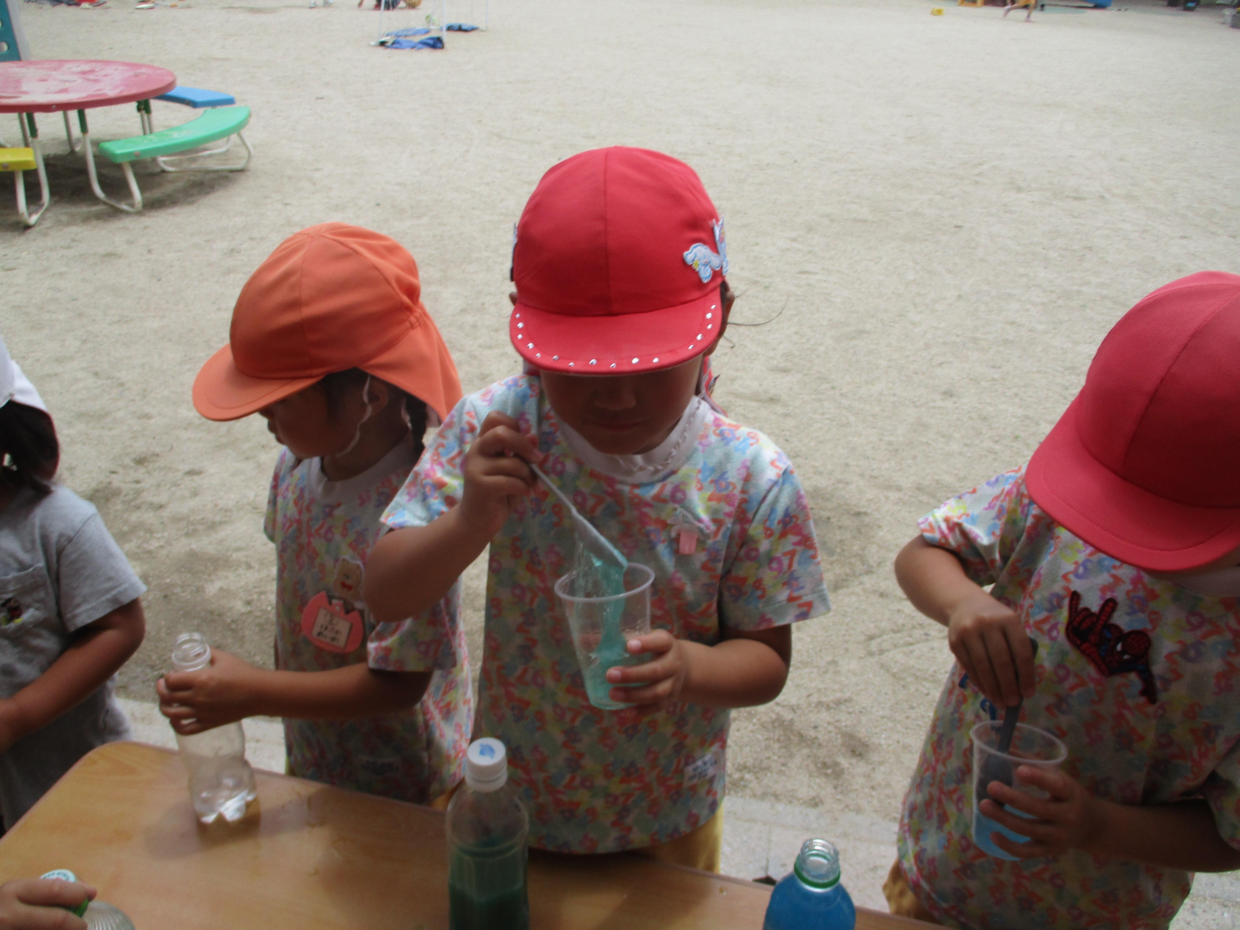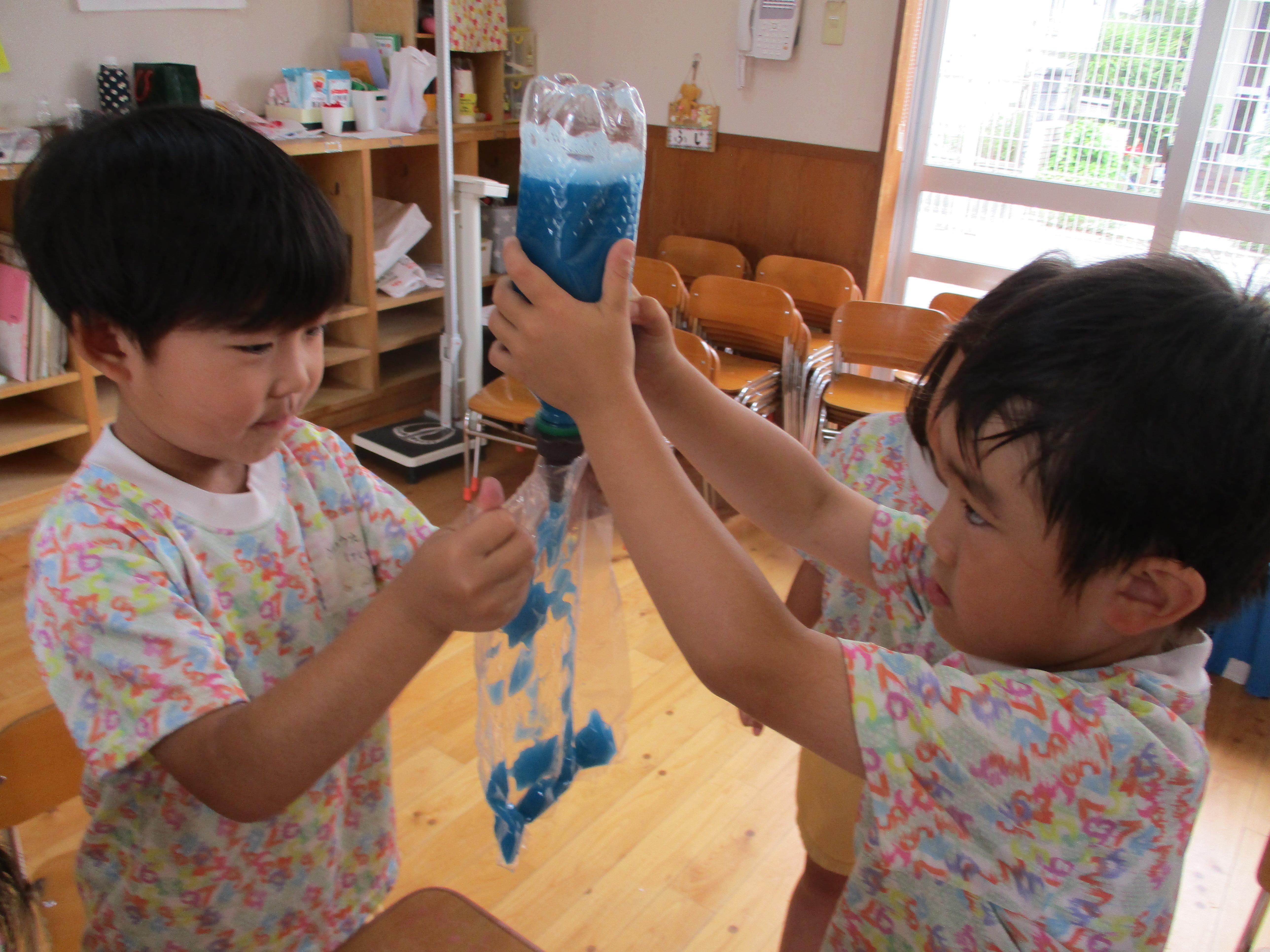 ペットボトルに水を入れ、好きな色の絵の具を入れて作った色水。その色水を使って、スライム、氷絵具、シャボン玉はじきなど、いろいろな遊びを楽しみました。