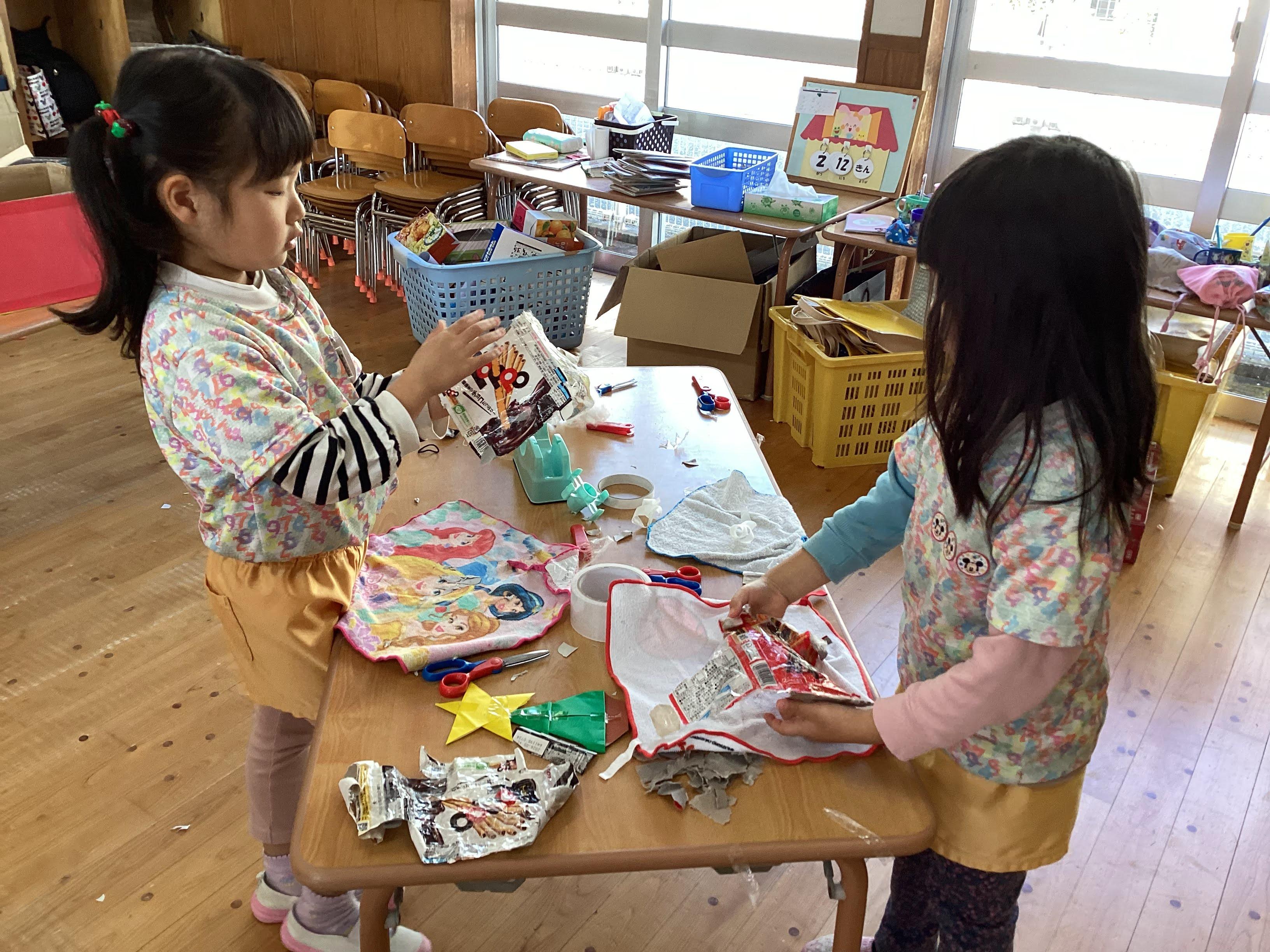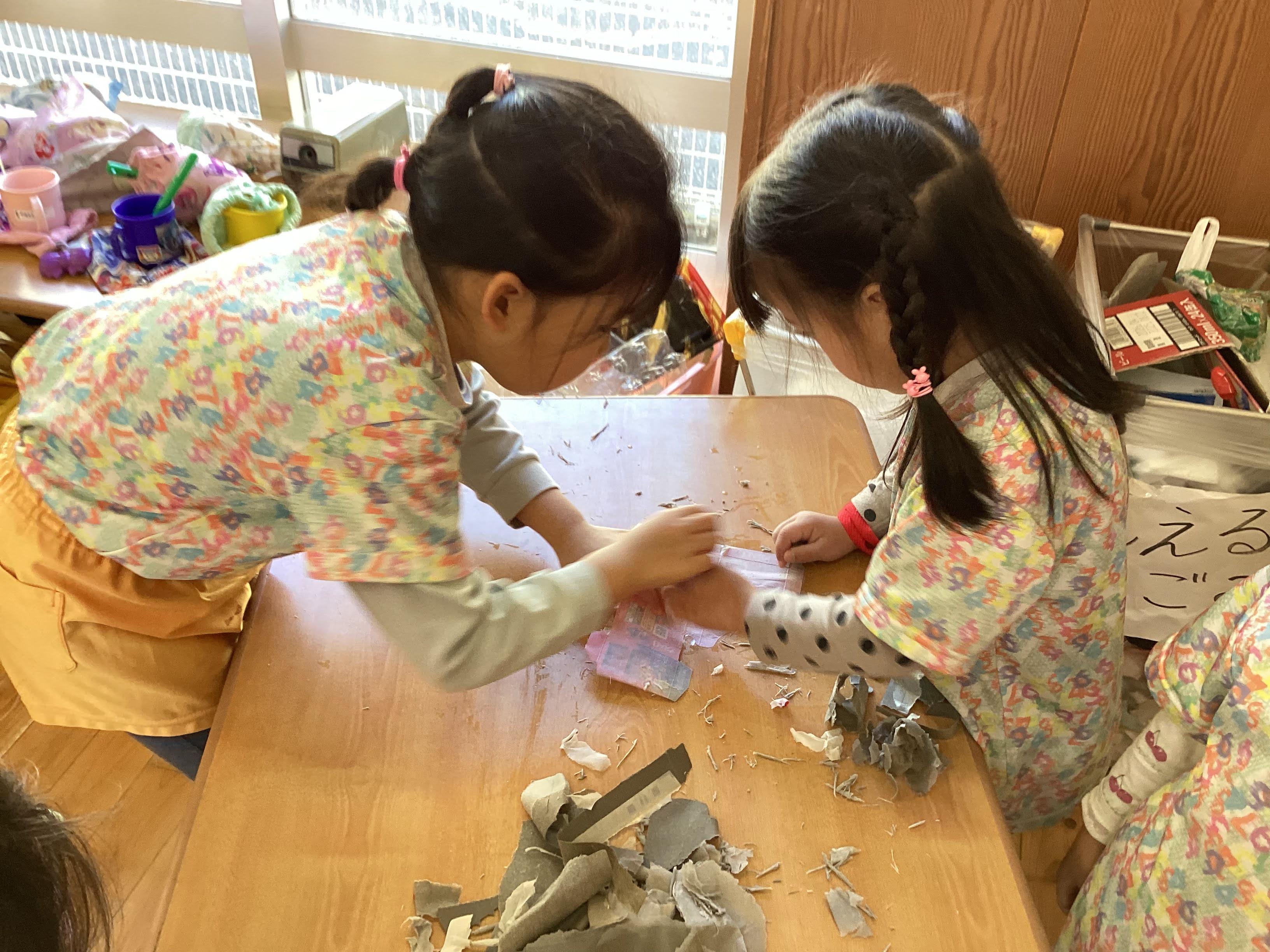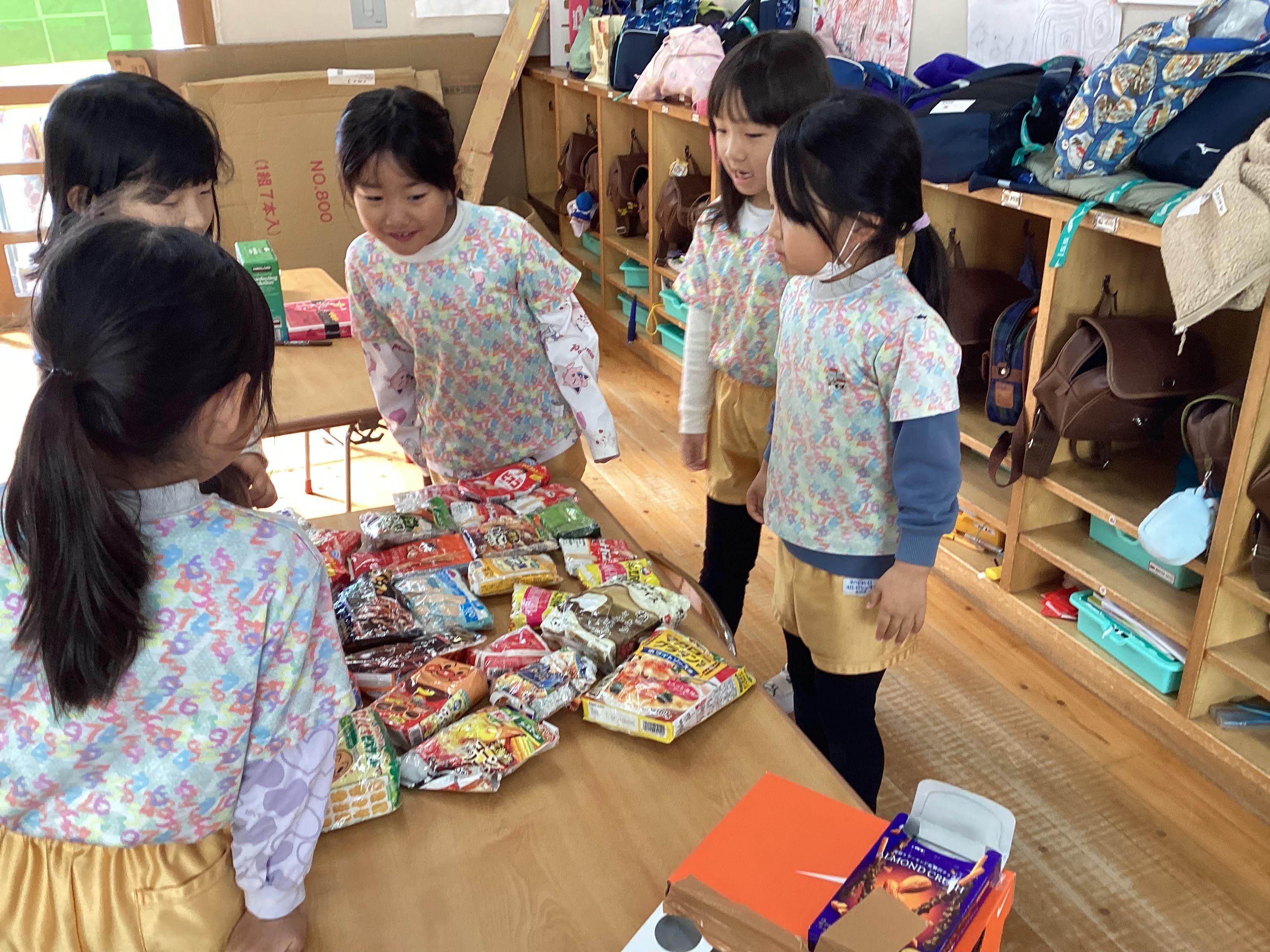 個々で作っていたスクイーズを集めて、お店屋さんごっこにつながりました。その後、年下児に作り方を教えてあげる姿も見られました。