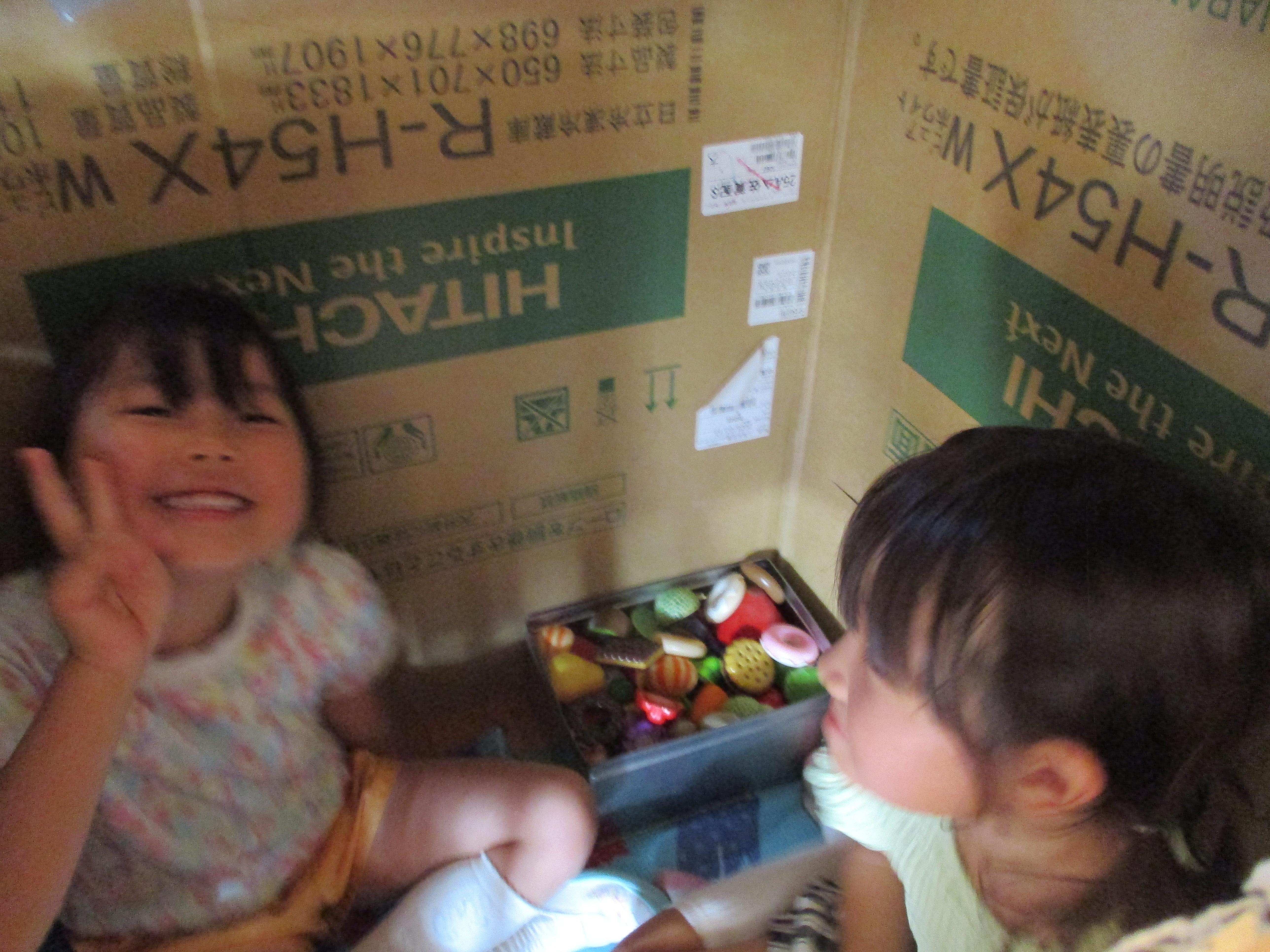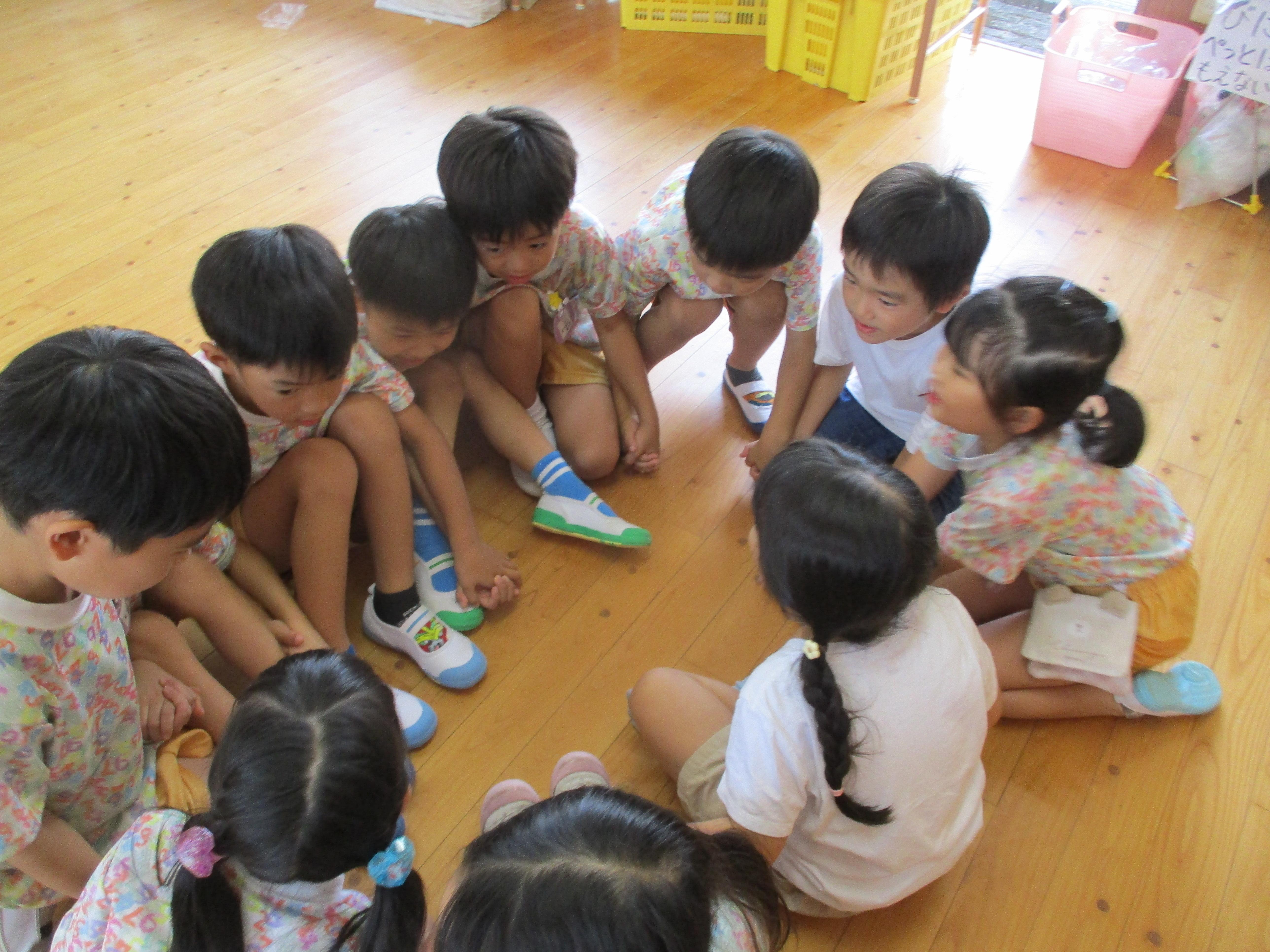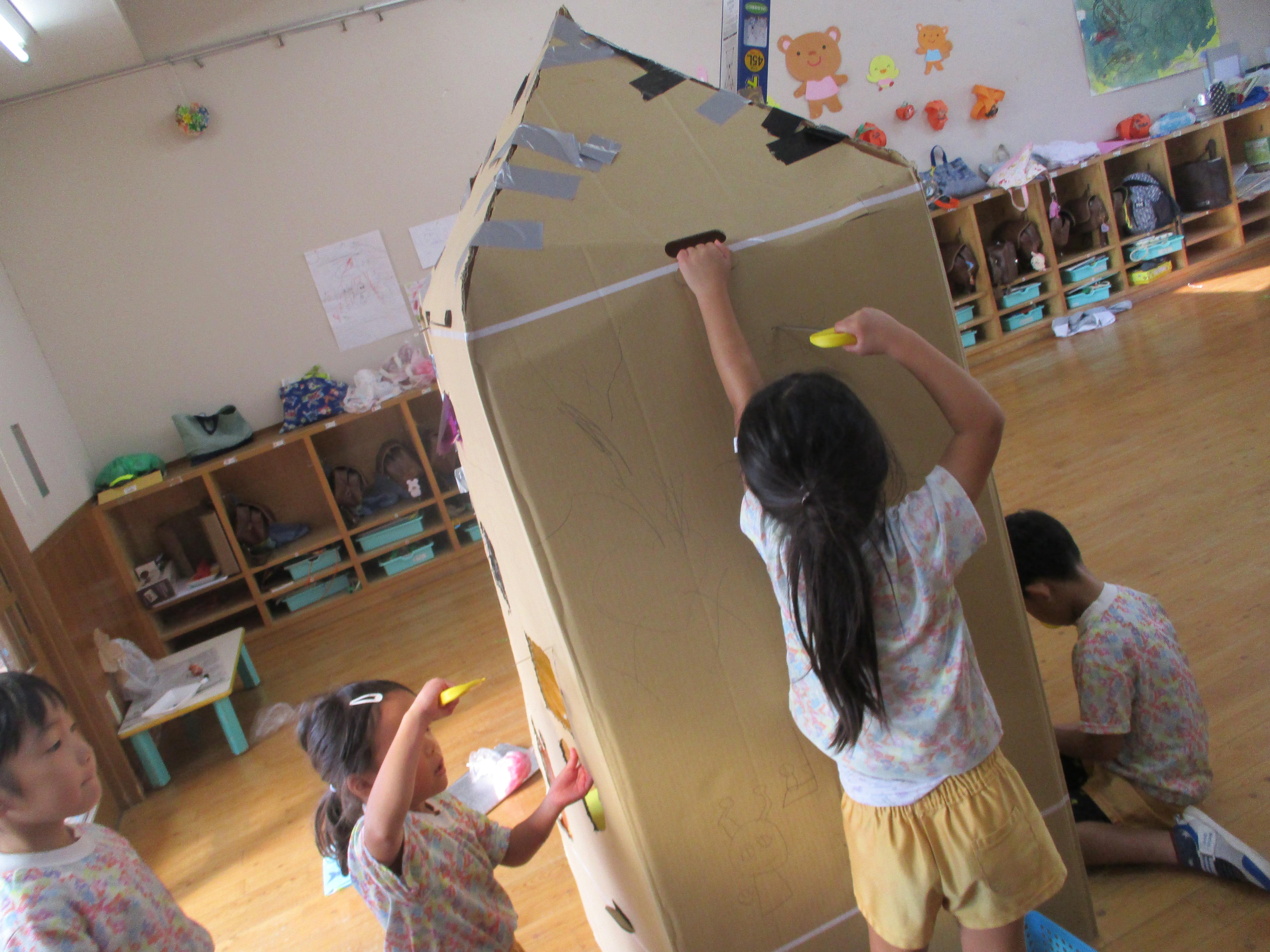 2学期になると、サークルタイムを使ってみんなで話し合いをしたり、協力しながら一つの物を作り上げる姿が見られるようになりました。みんなで作ったテントは、中でままごとをしたり、着替えの部屋になったり、大活躍でした。