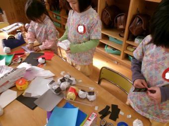 室内では素材あそびがよく見られます。ひとつの素材からいろいろなあそび方、制作が生まれ、子どもたちの発想力の豊かさには驚かされます。
